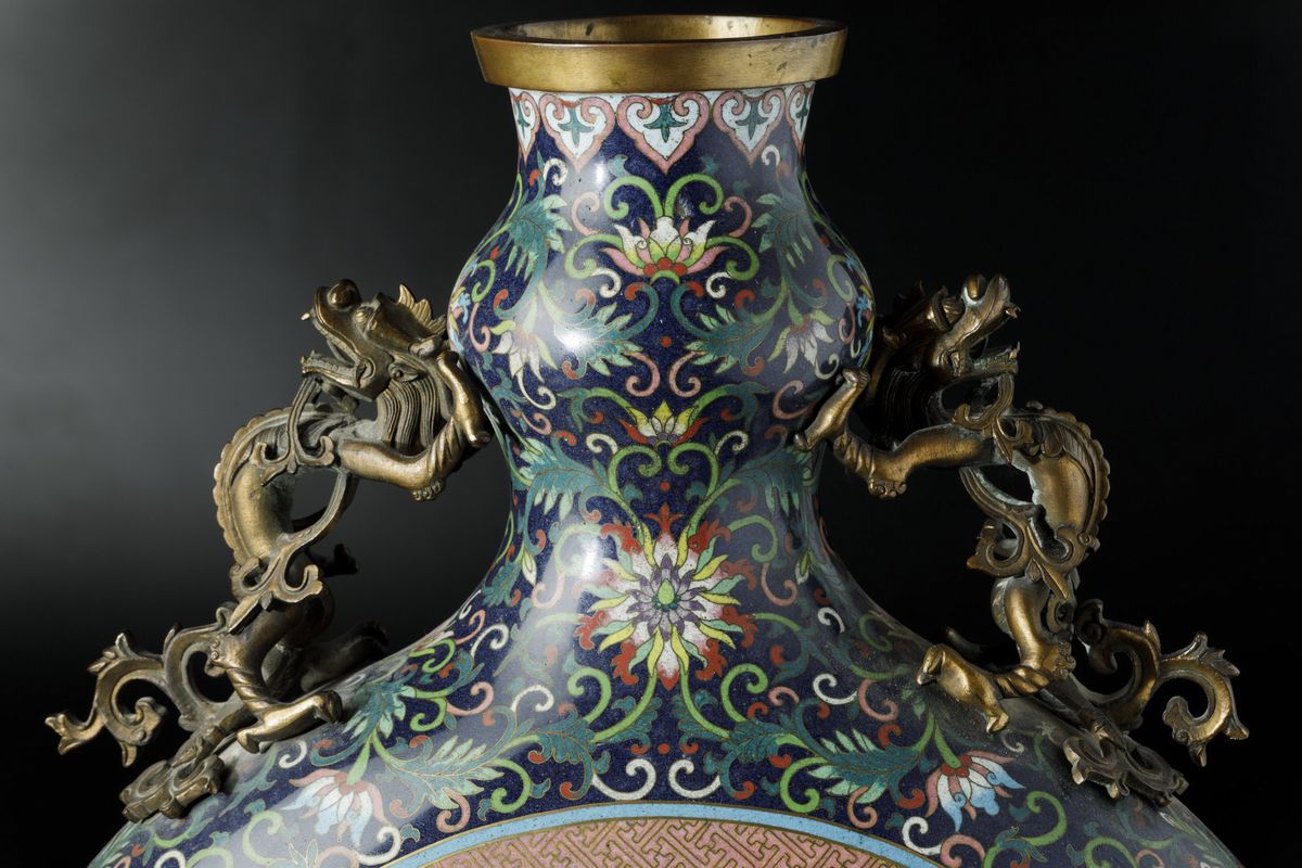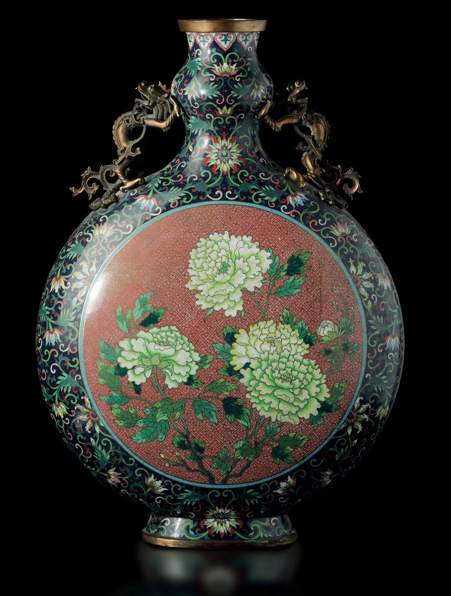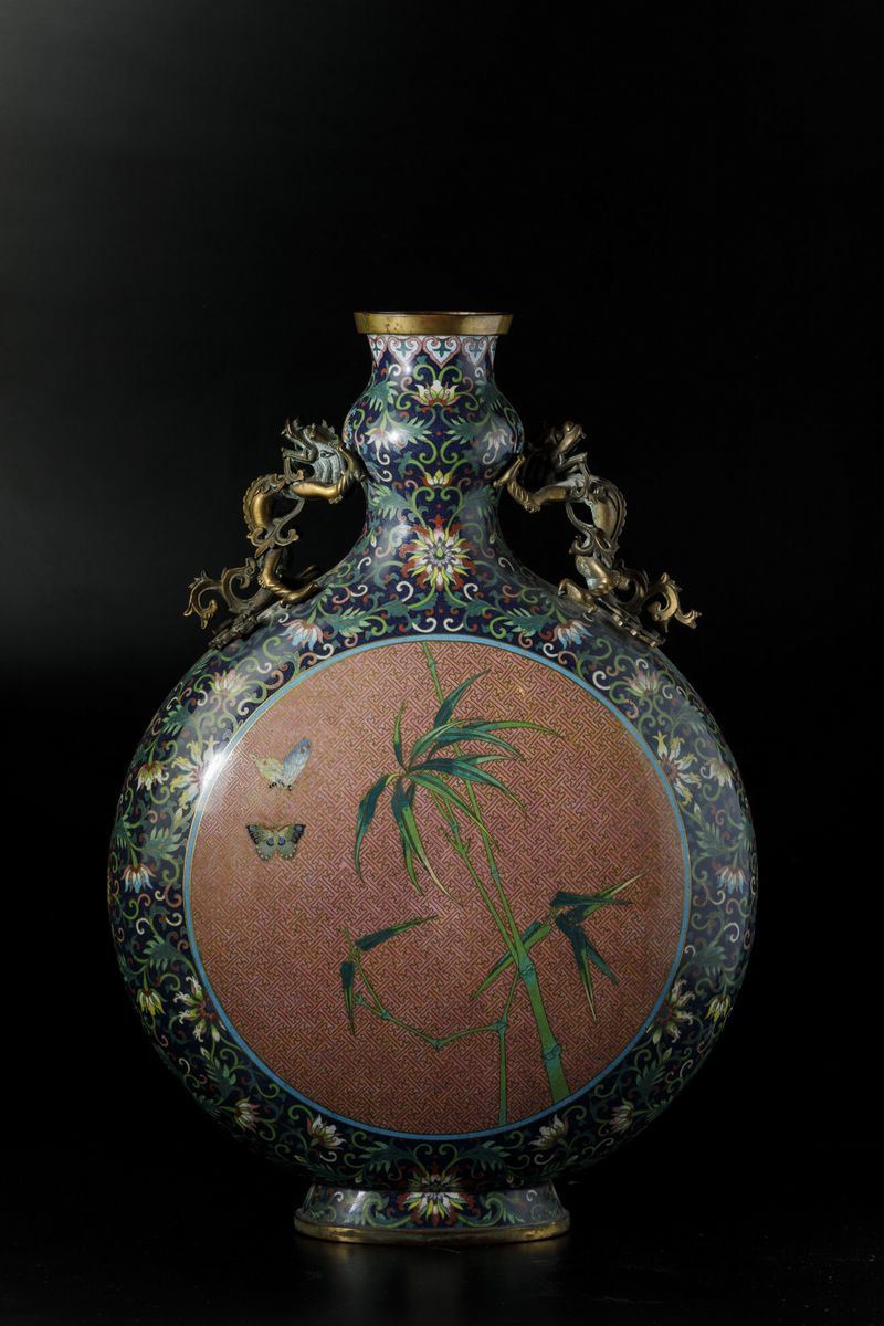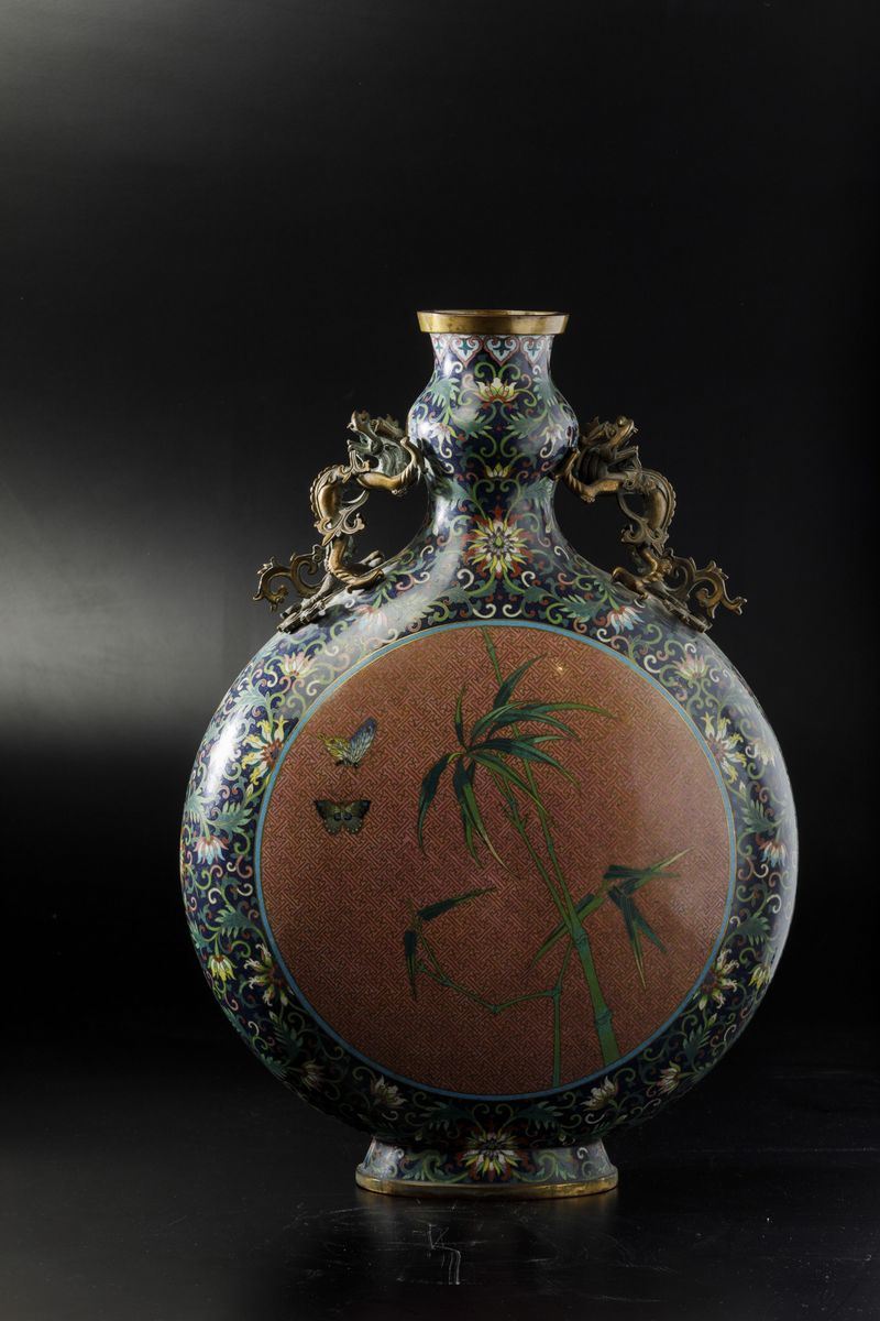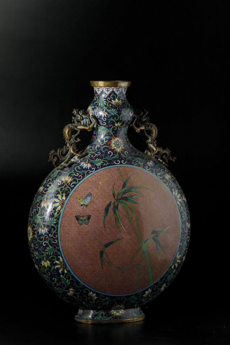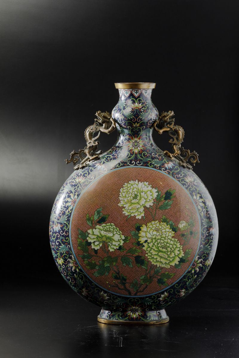 Grande fiasca a smalti cloisonnè con soggetti naturalisti entro riserve centrali, decori floreali e anse a foggia di draghetto, Cina, Dinastia Qing, epoca Jiaqing (1796-1820)