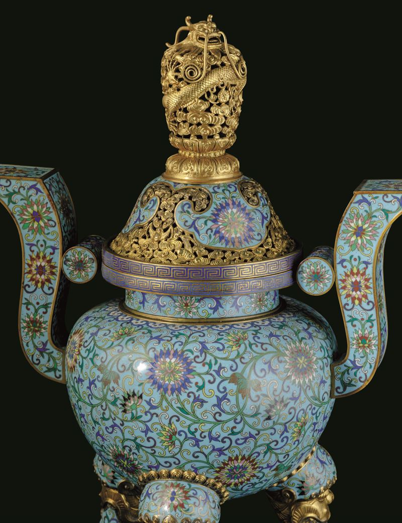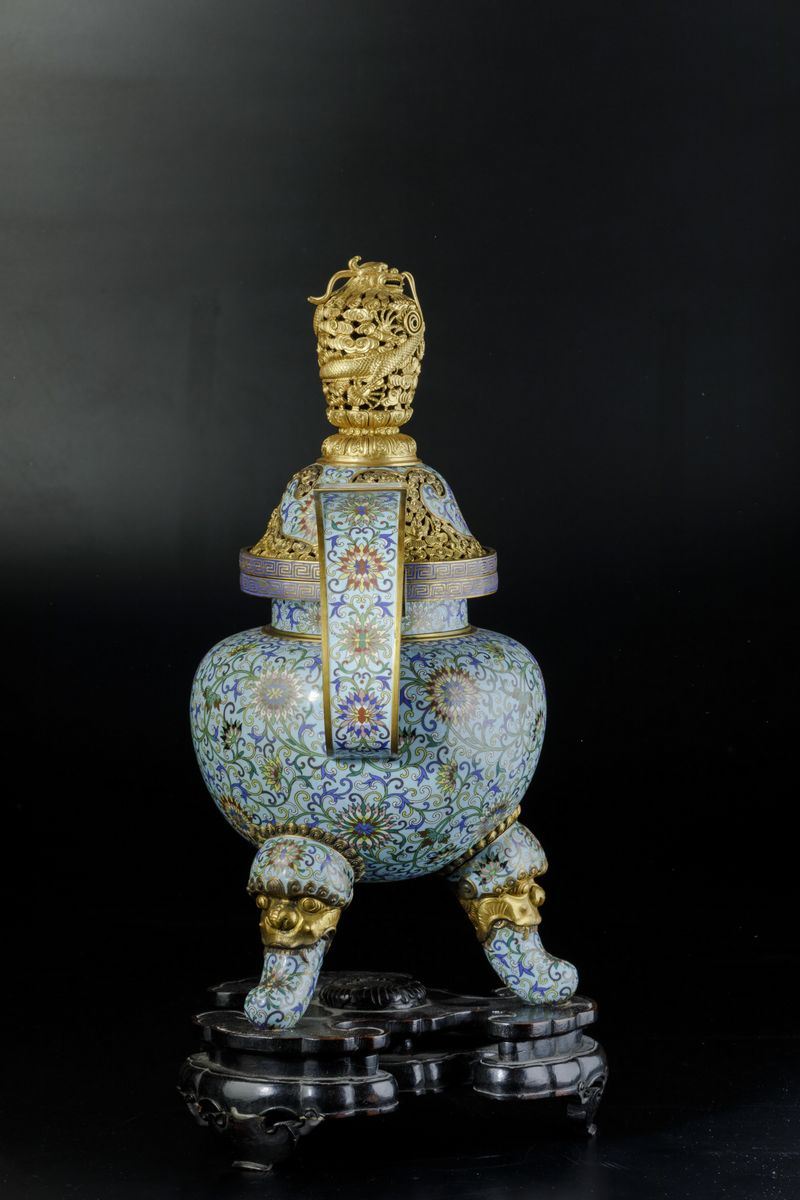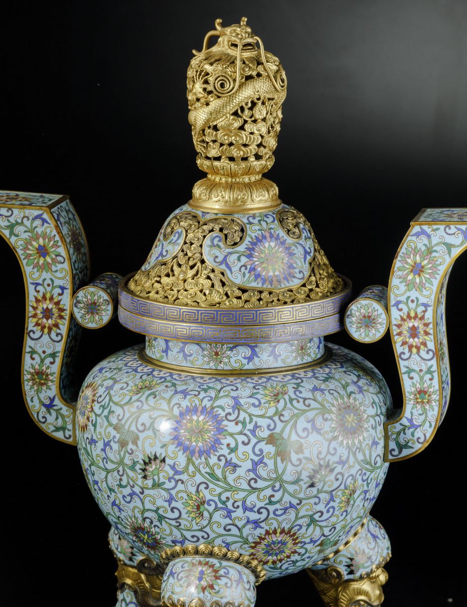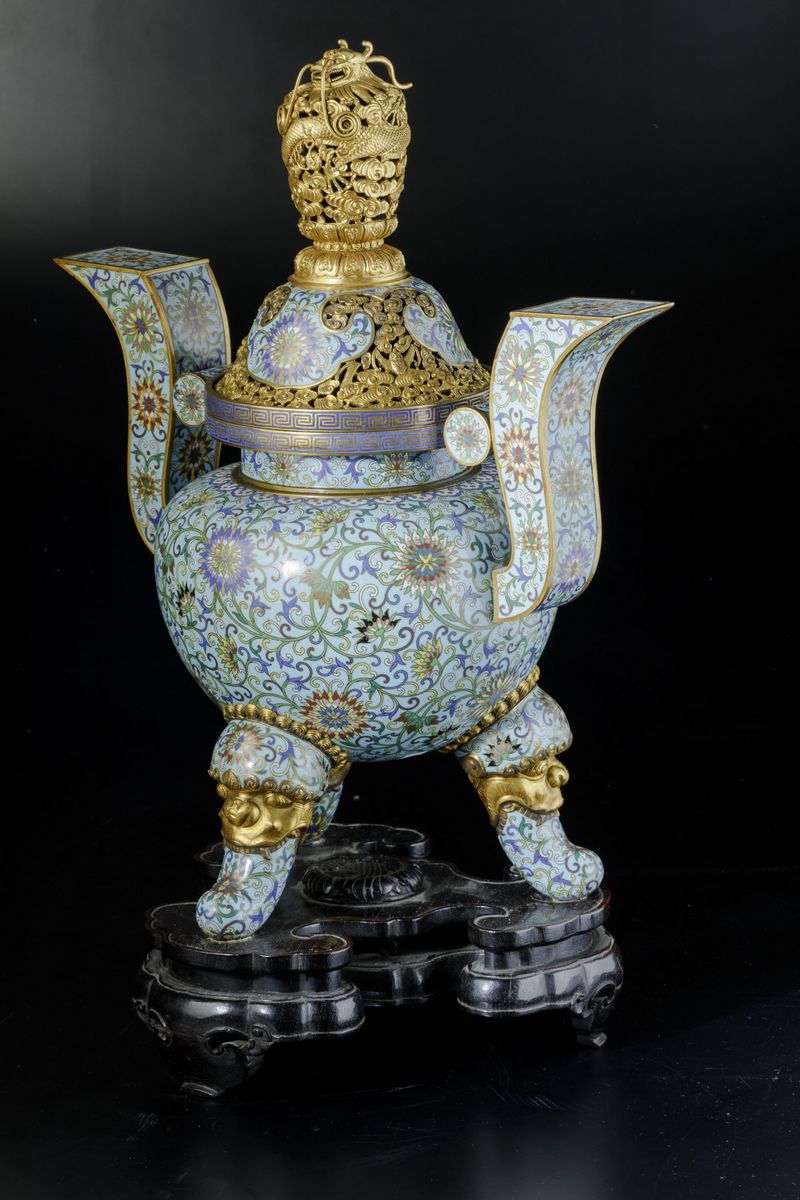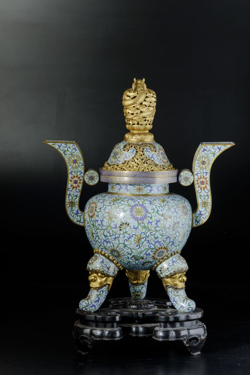 Grande incensiere tripode a smalti con decoro di fiori di loto su fondo azzurro e coperchio in bronzo dorato lavorato a traforo con drago tra le nuvole, Cina, Dinastia Qing, epoca Jiaqing (1796-1820)