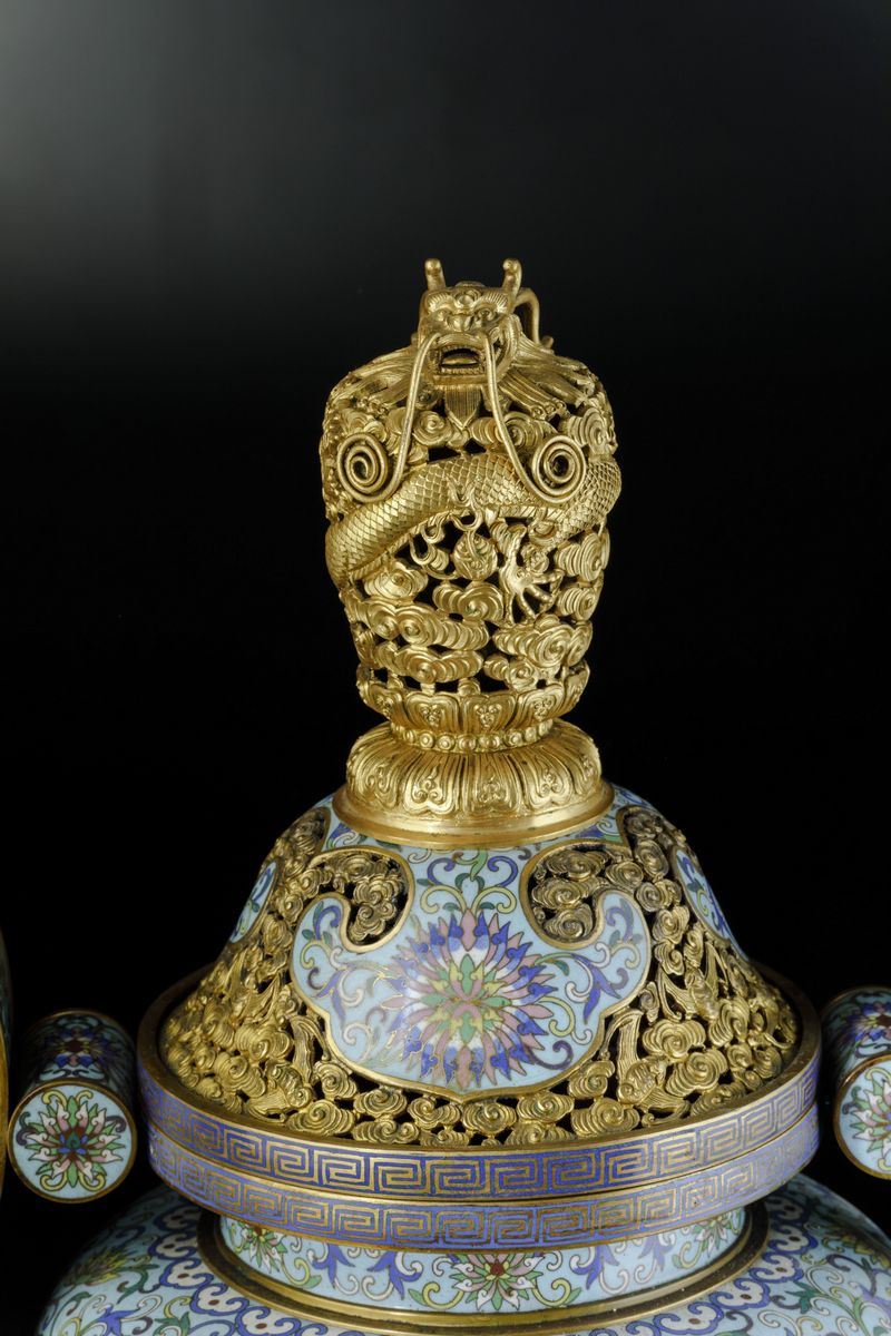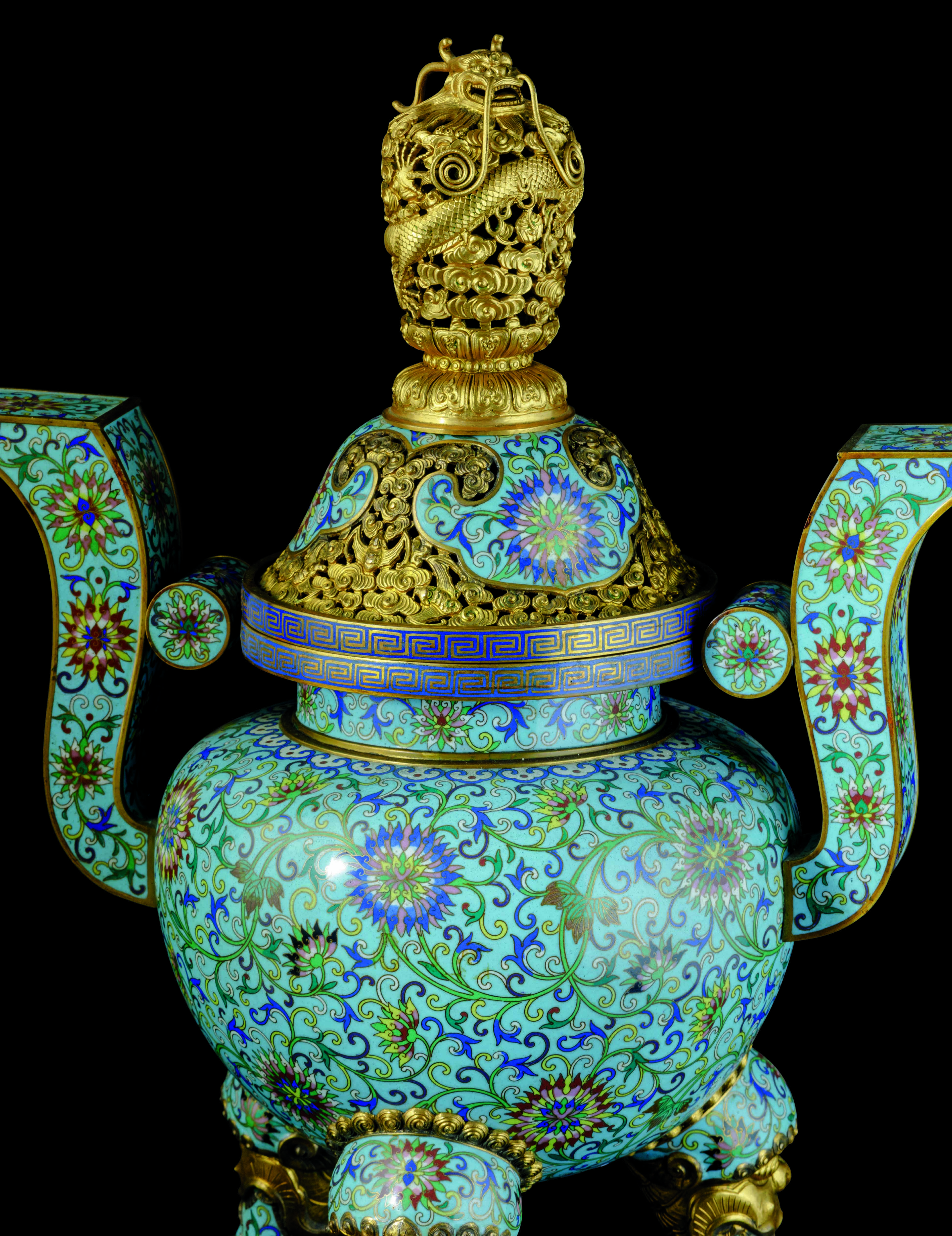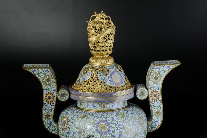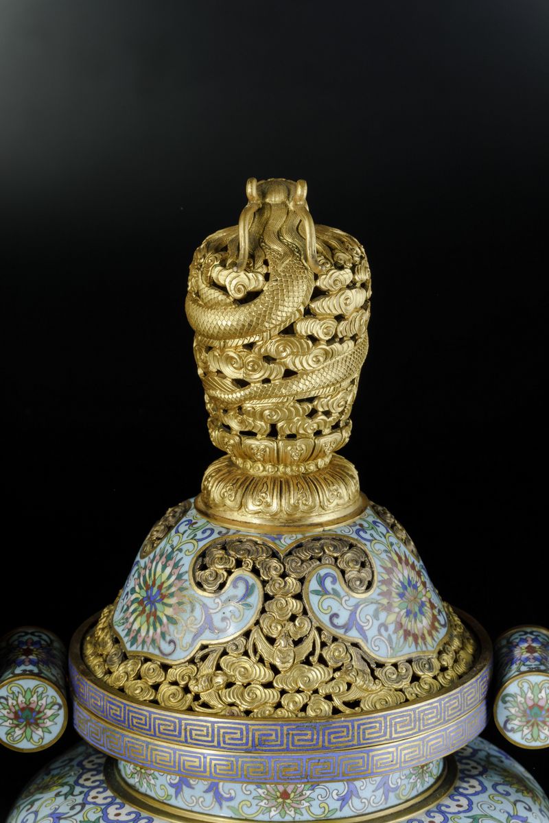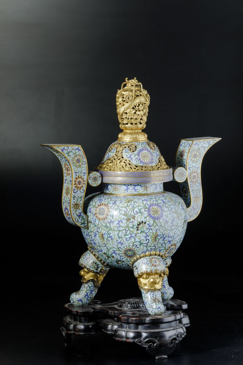 Grande incensiere tripode a smalti con decoro di fiori di loto su fondo azzurro e coperchio in bronzo dorato lavorato a traforo con drago tra le nuvole, Cina, Dinastia Qing, epoca Jiaqing (1796-1820)