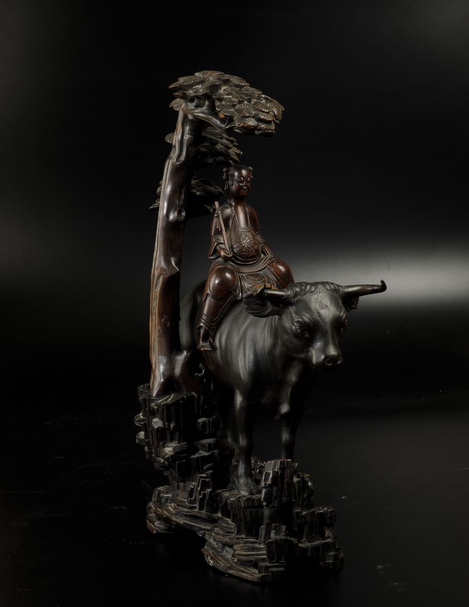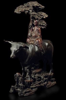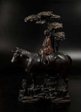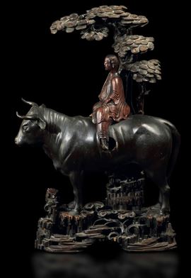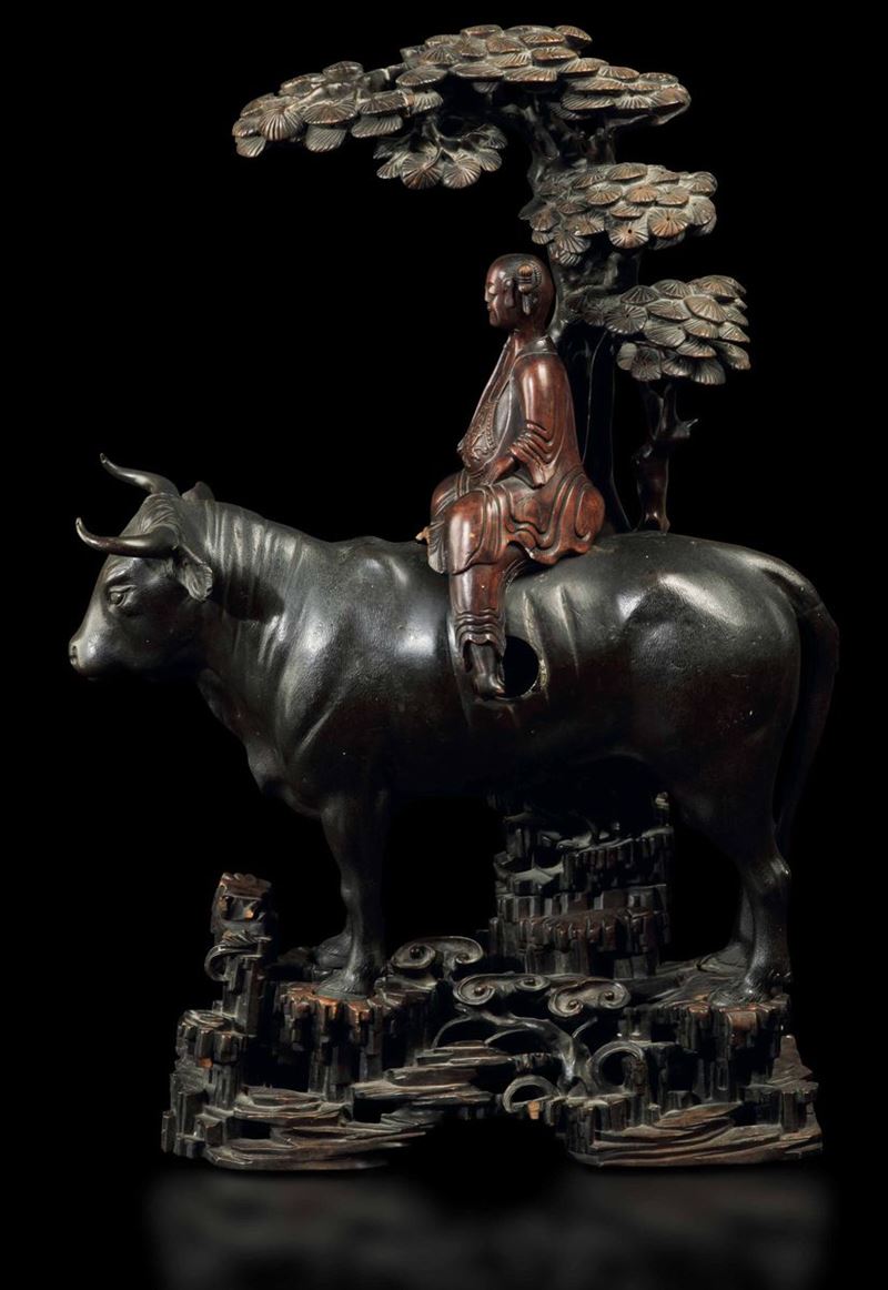 Gruppo in legno e bronzo raffigurante figura di uomo seduto su bue, Cina, Dinastia Qing, epoca Qianlong (1736-1796)