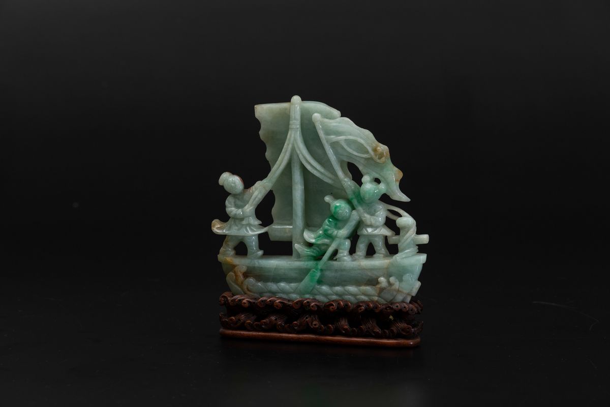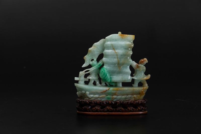 Gruppo scolpito in giadeite Celadon con sfumature verde mela raffigurante imbarcazione con pescatori, Cina, inizi XX seco [..]