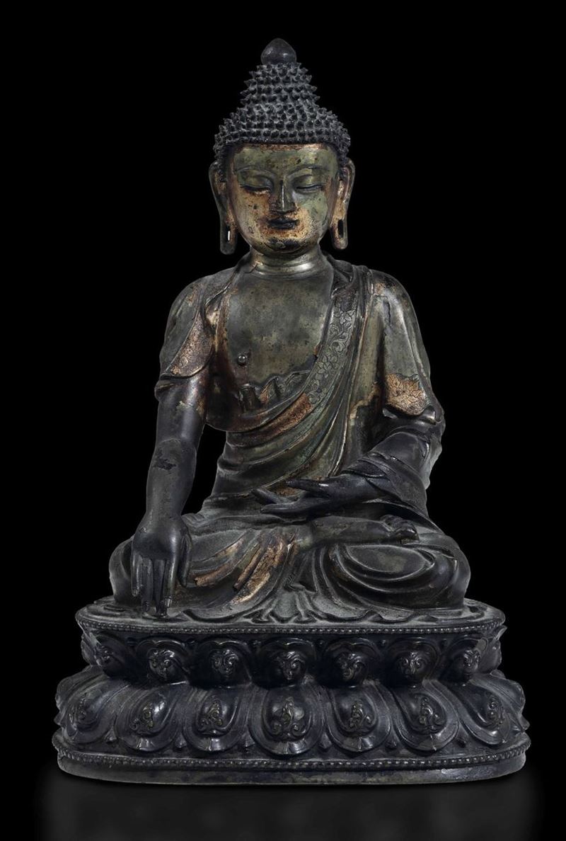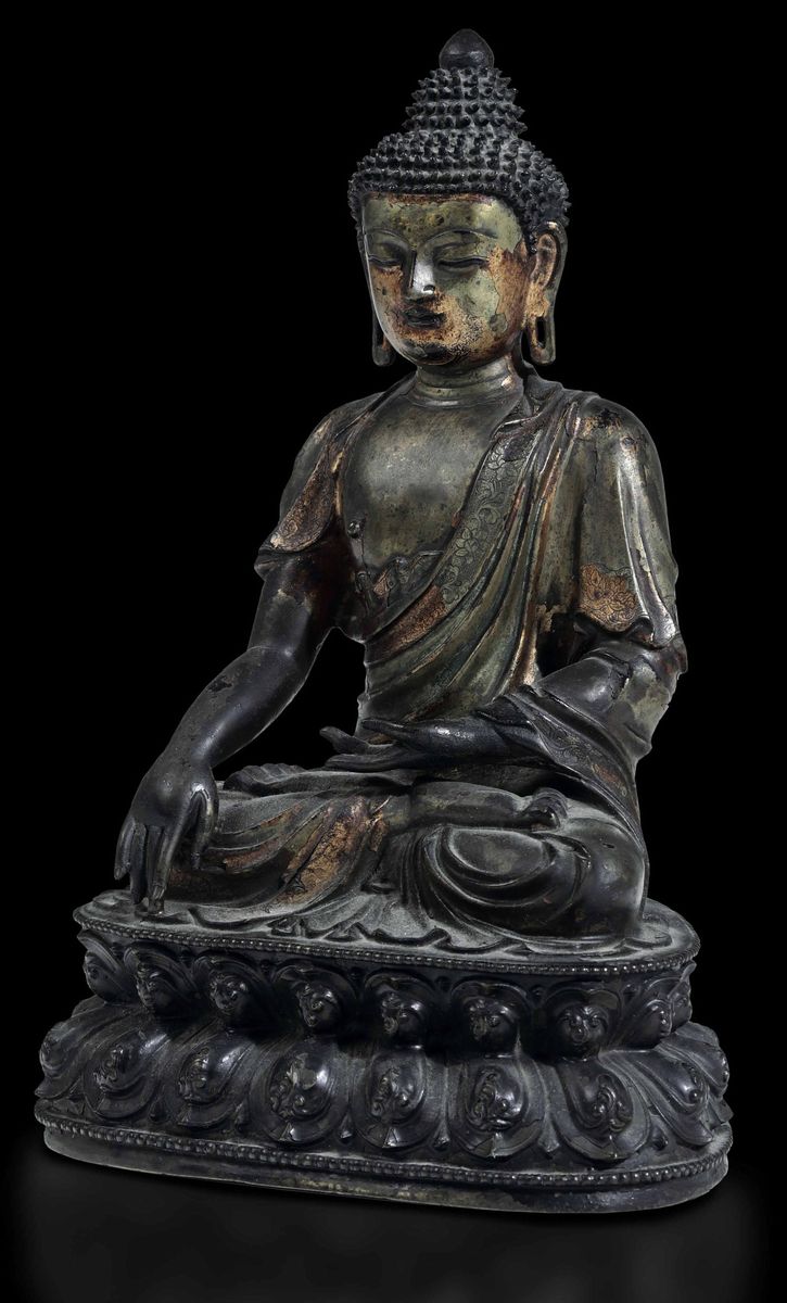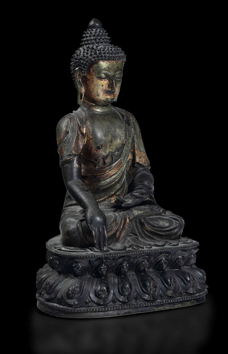 Importante figura di Buddha Sakyamuni seduto su doppio fiore di loto in bronzo con tracce di doratura, Cina, XVI secolo