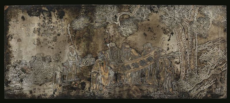 Matrice da inchiostro in metallo incisa raffigurante saggi che consultano uno scroll e incisione, Cina, Dinastia Qing, XIX [..]