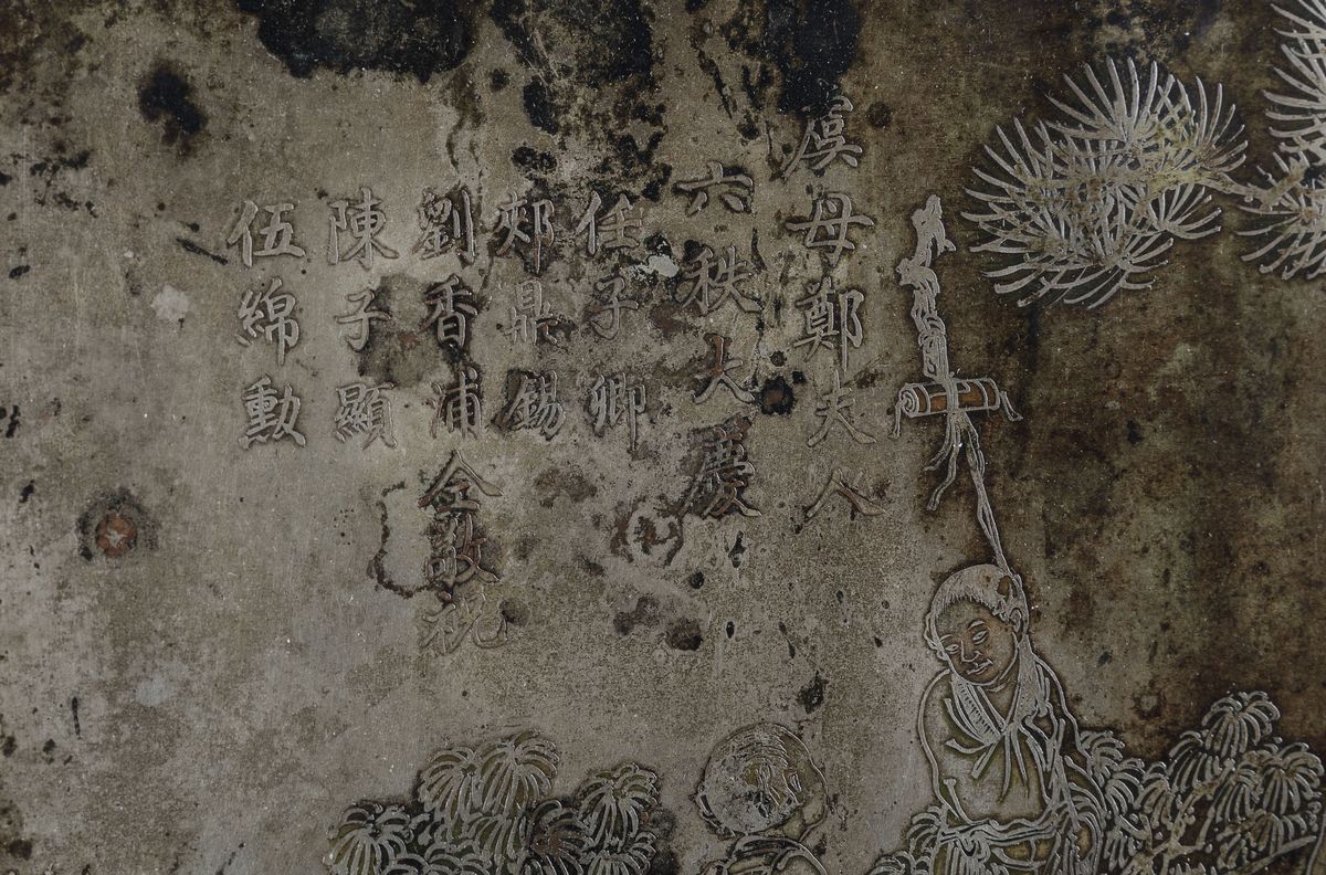 Matrice da inchiostro in metallo incisa raffigurante saggi che consultano uno scroll e incisione, Cina, Dinastia Qing, XIX secolo