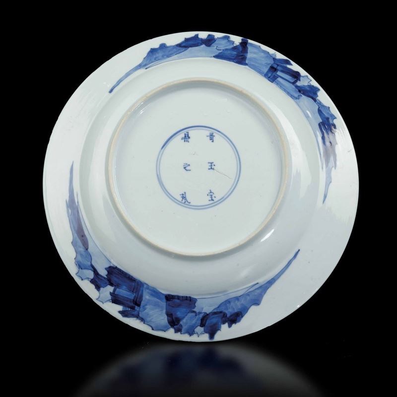Piatto in porcellana bianca e blu con scena di concerto e decori floreali entro riserve, Cina, Dinastia Qing, epoca Kangxi [..]