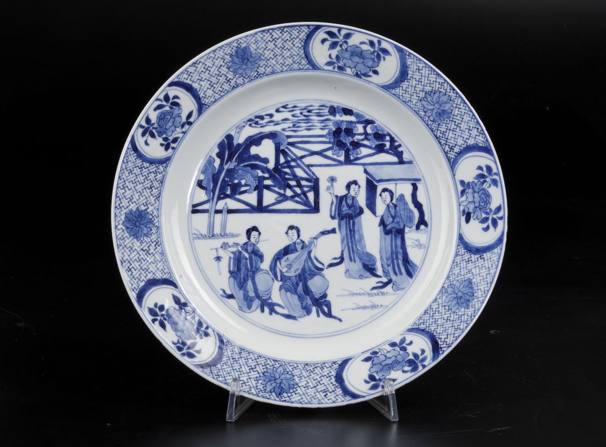 Piatto in porcellana bianca e blu con scena di concerto e decori floreali entro riserve, Cina, Dinastia Qing, epoca Kangxi (1662-1722)
