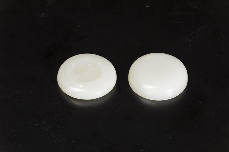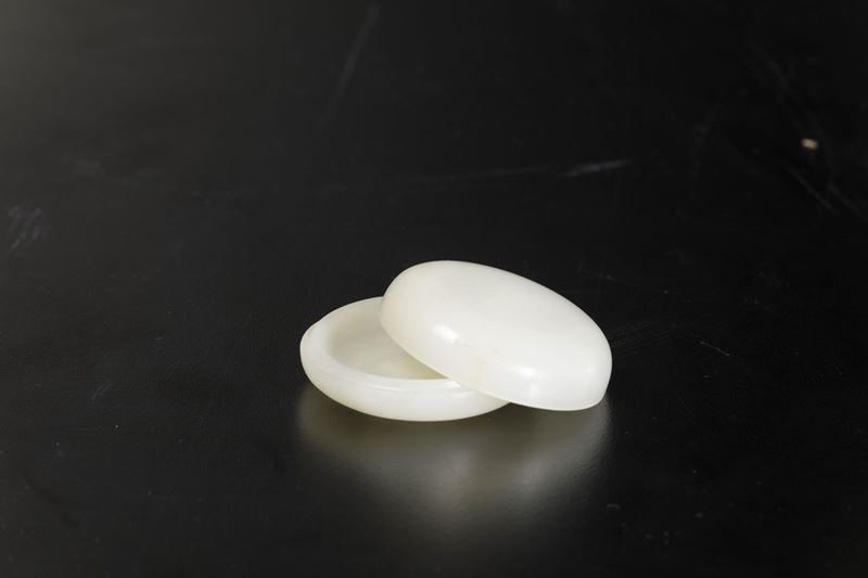 Piccola scatola circolare scolpita in giada bianca, Cina, Dinastia Qing, epoca Qianlong (1736-1796)
