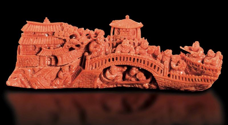 Piccolo gruppo scolpito in corallo raffigurante paesaggio con pagode, Cina, inizi XX secolo