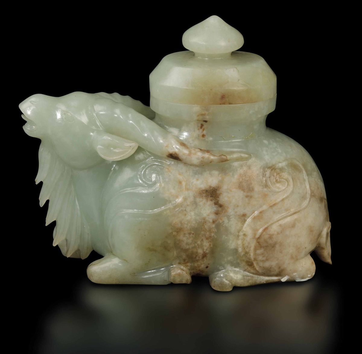 Piccolo vaso con coperchio a foggia di caprone scolpito in giada bianca e russet, Cina, Dinastia Qing, XIX secolo