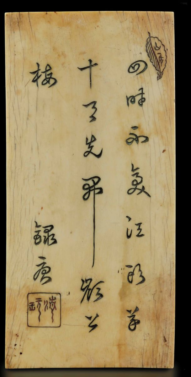 Placca in avorio con personaggi su imbarcazione e iscrizione al retro, Cina, Dinastia Qing, XIX secolo