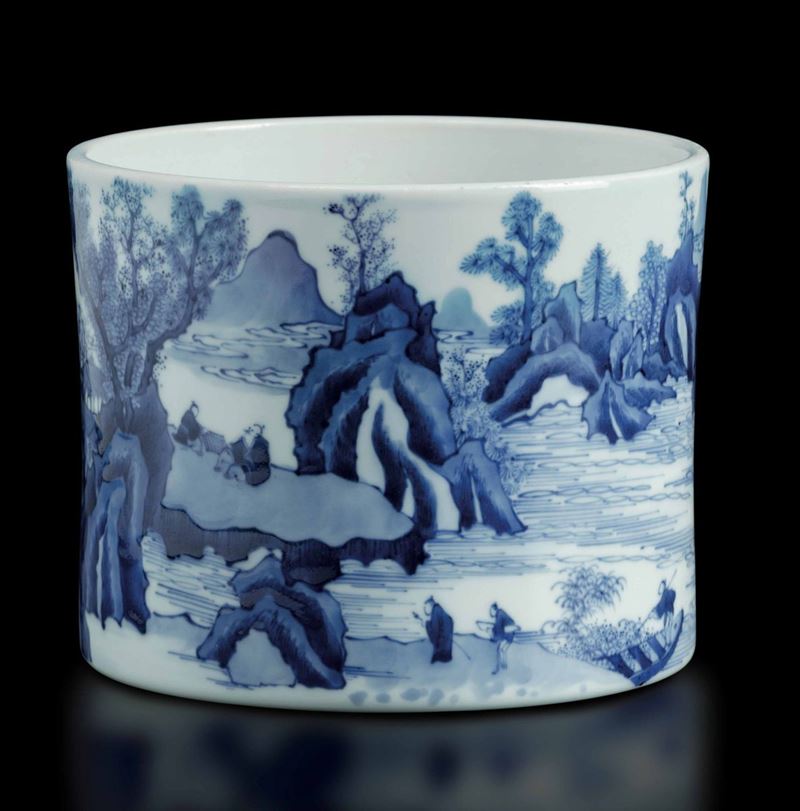 Portapennelli in porcellana bianca e blu con raffigurazione di paesaggio in stile Master of the Rocks, Cina, Dinastia Qing, [..]