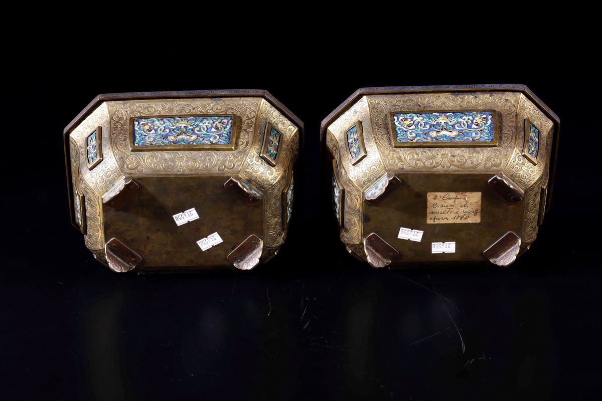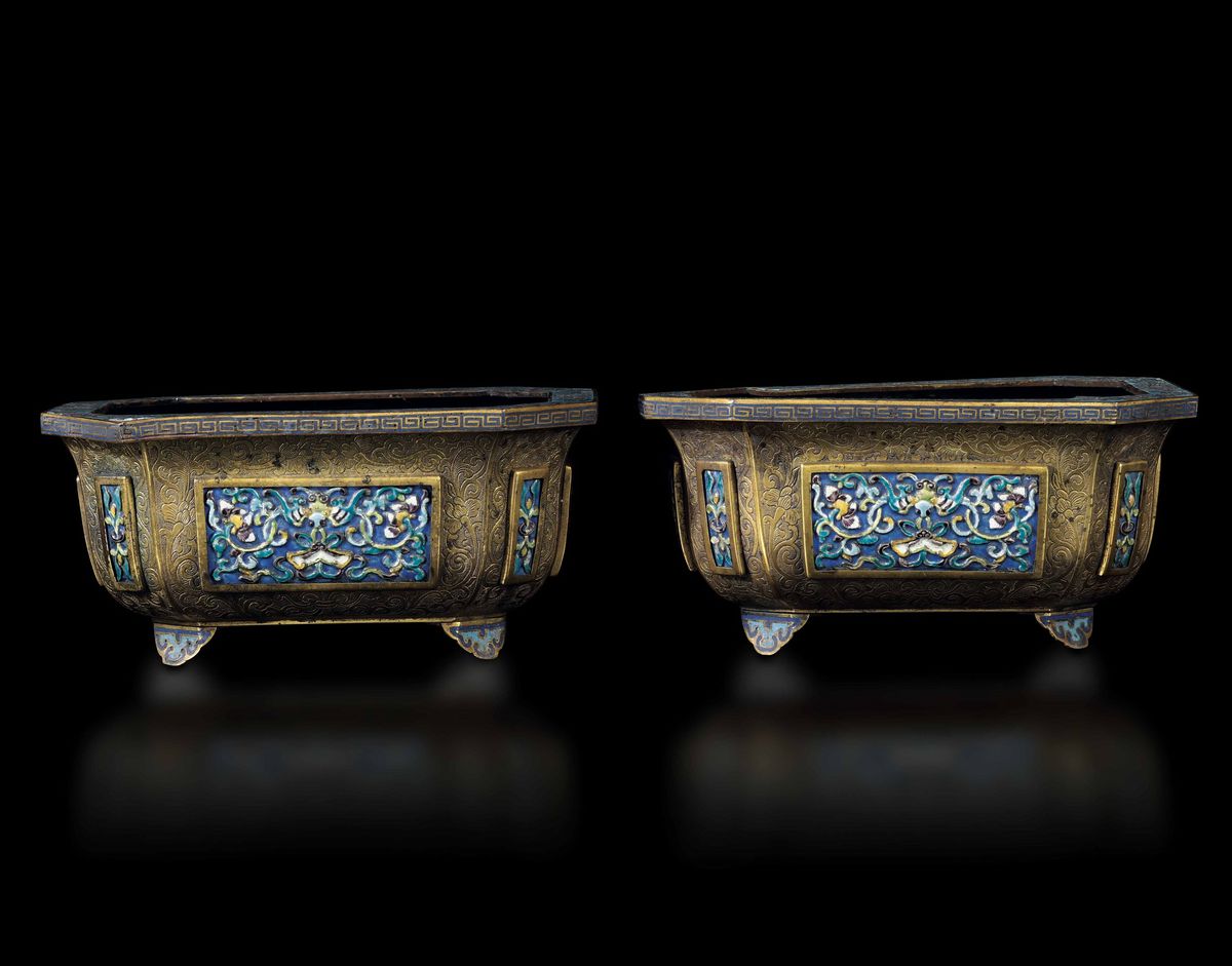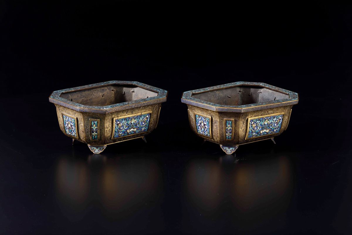 Rara coppia di giardiniere in bronzo dorato e placche a smalti e cloisonnè con decori floreali, Cina, Dinastia Qing, epoca [..]
