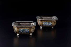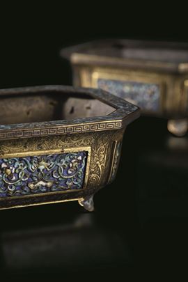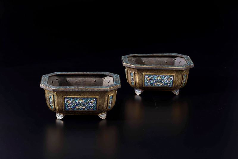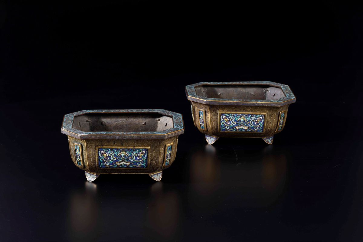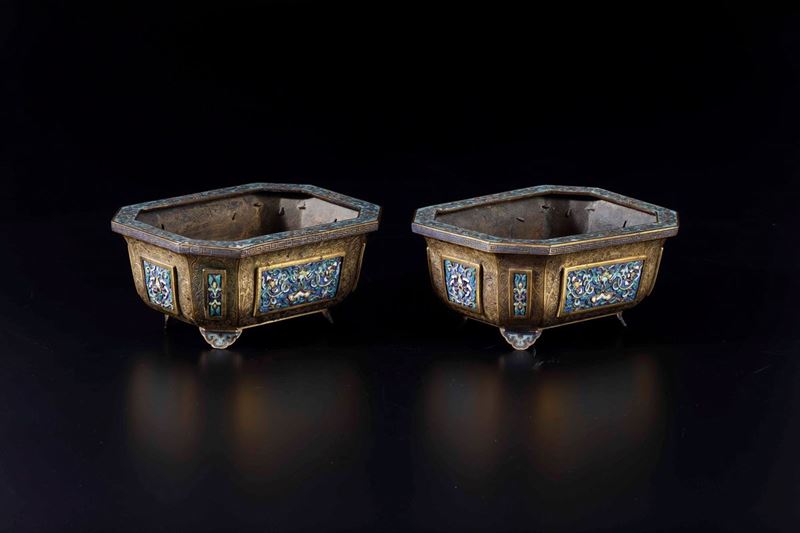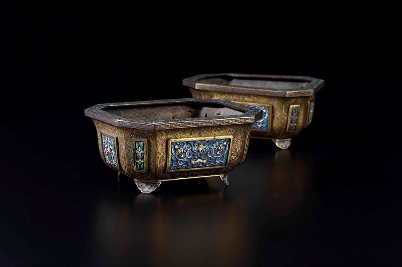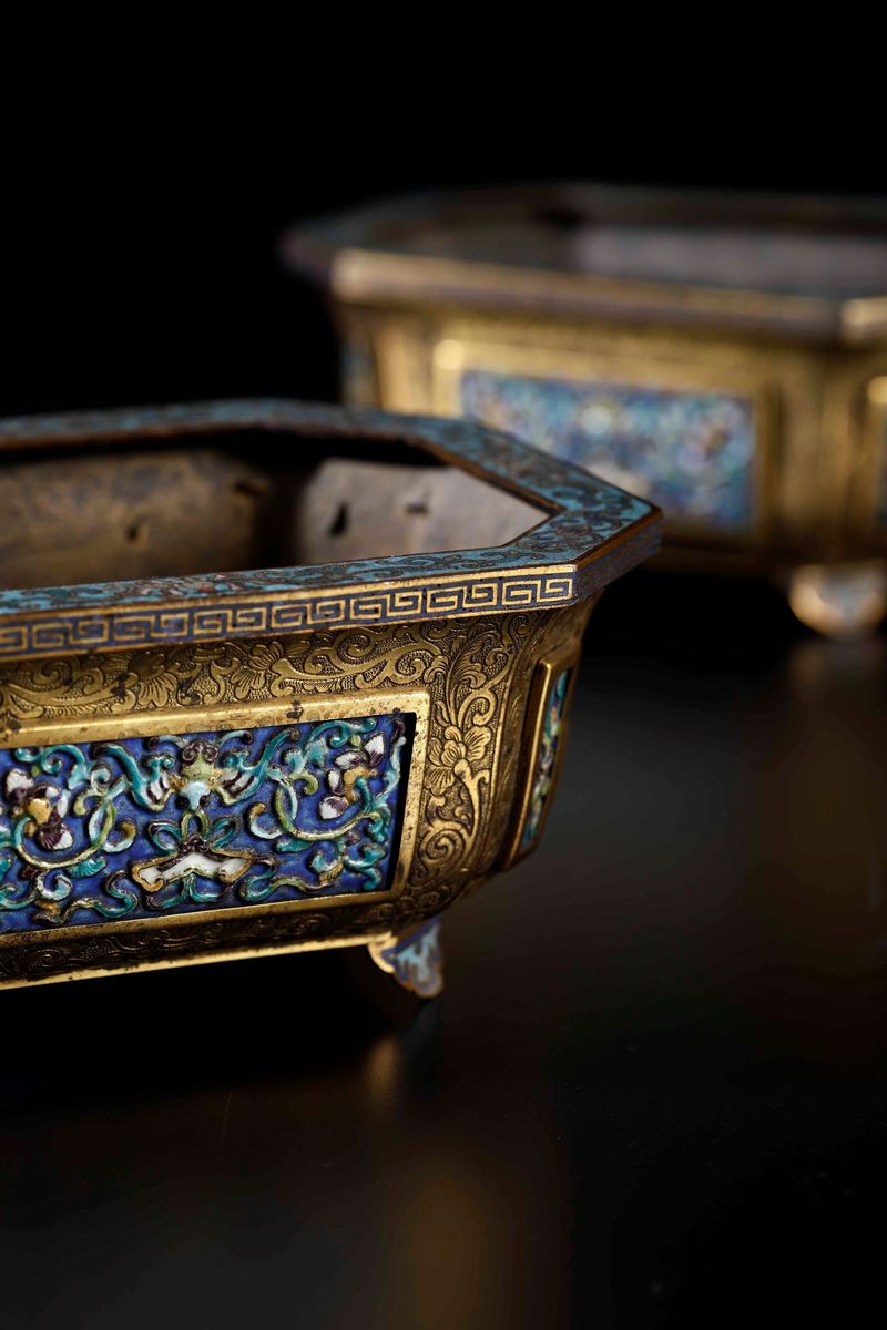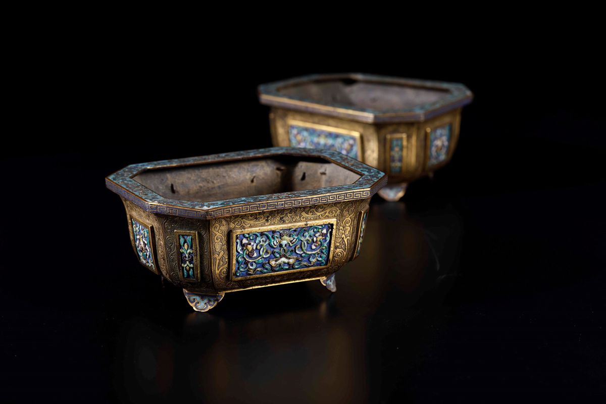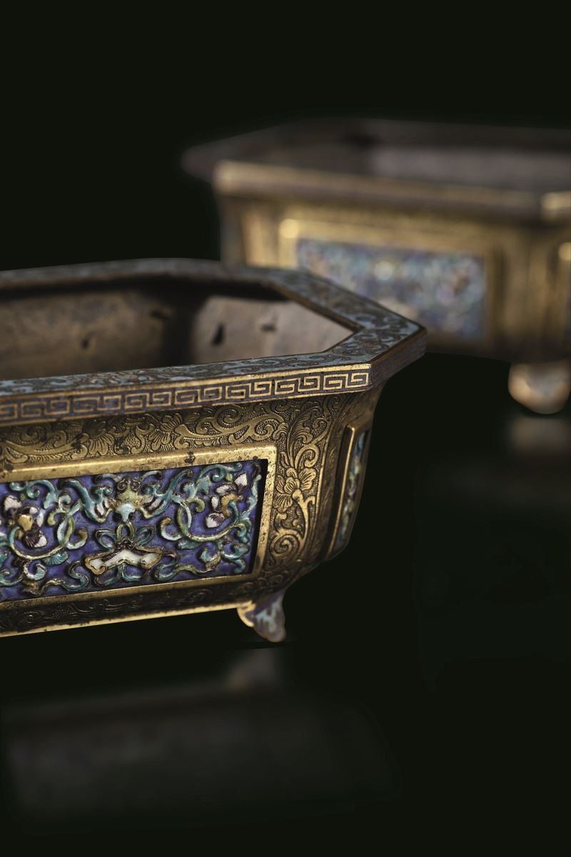 Rara coppia di giardiniere in bronzo dorato e placche a smalti e cloisonnè con decori floreali, Cina, Dinastia Qing, epoca Qianlong (1736-1796)