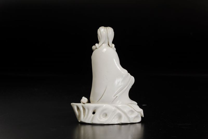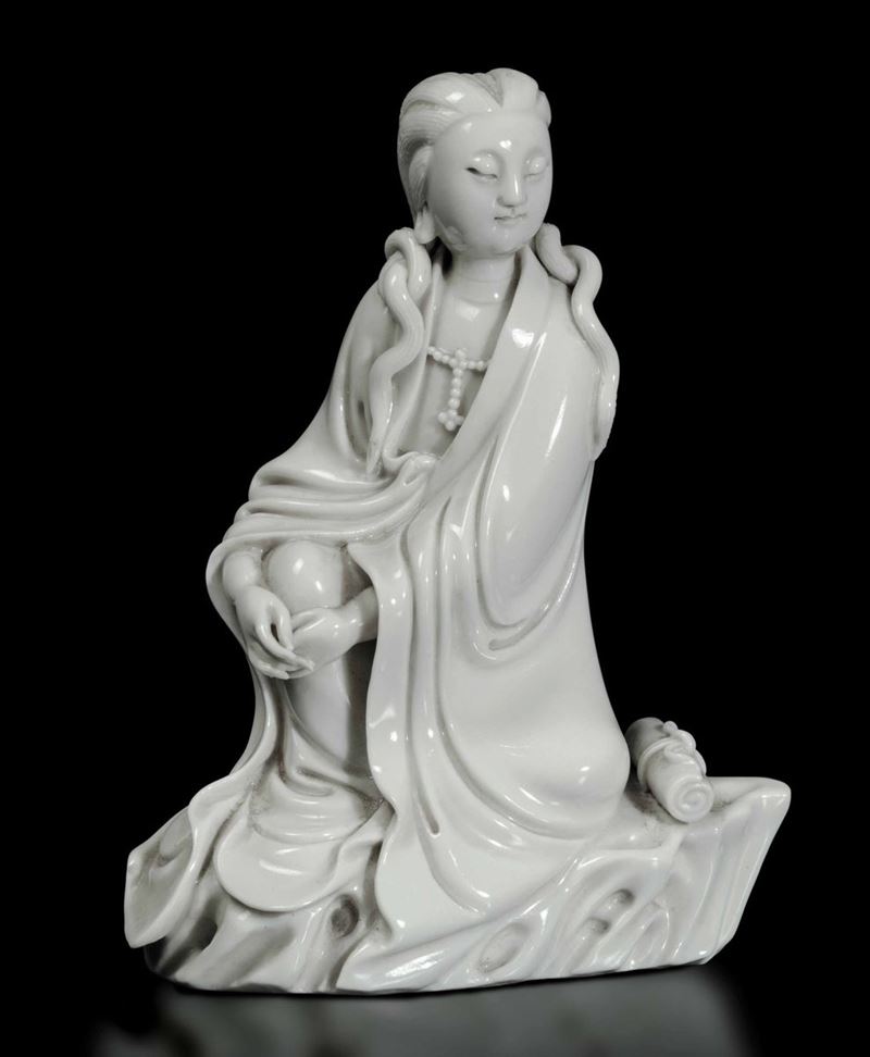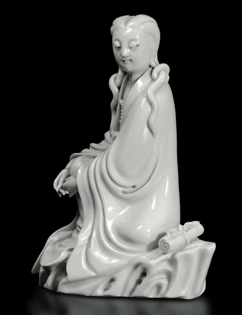 Rara e fine figura di Guanyin con scroll seduta su roccia in porcellana Blanc de Chine Dehua, Cina, Dinastia Qing, fine XVII secolo