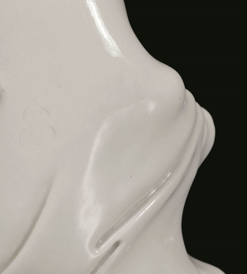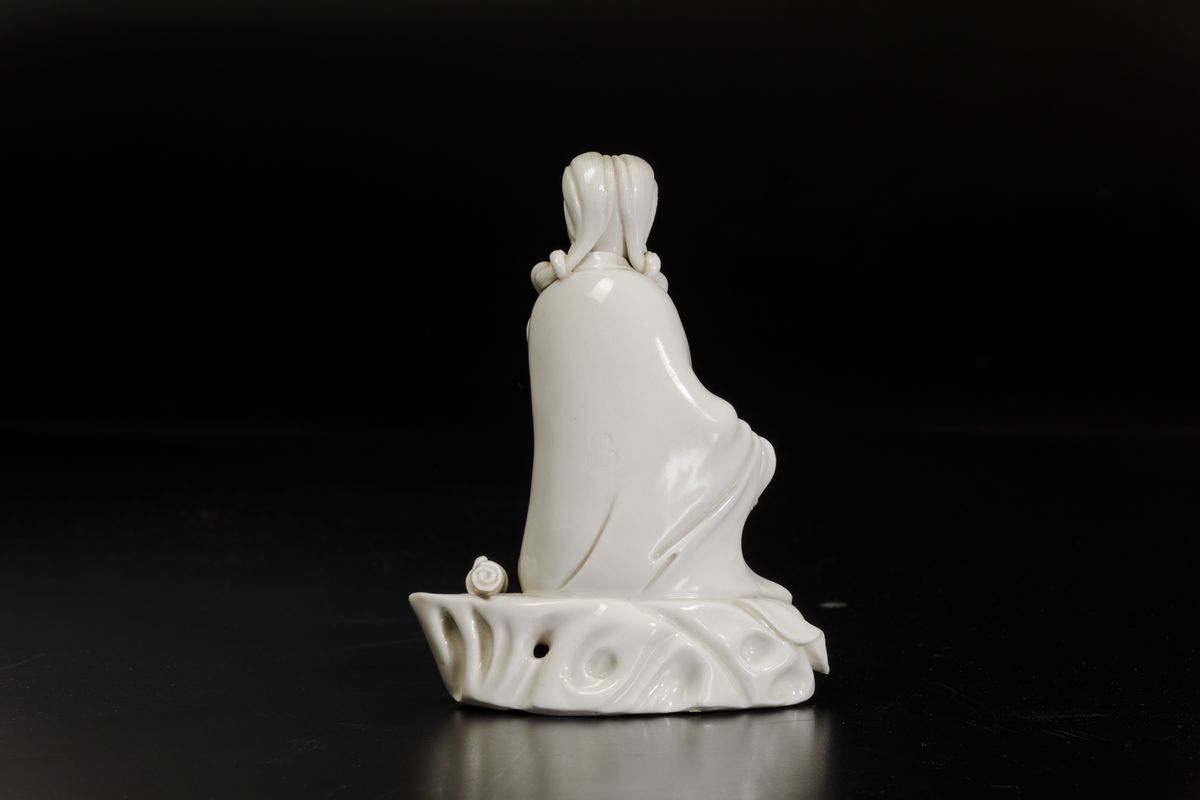 Rara e fine figura di Guanyin con scroll seduta su roccia in porcellana Blanc de Chine Dehua, Cina, Dinastia Qing, fine [..]