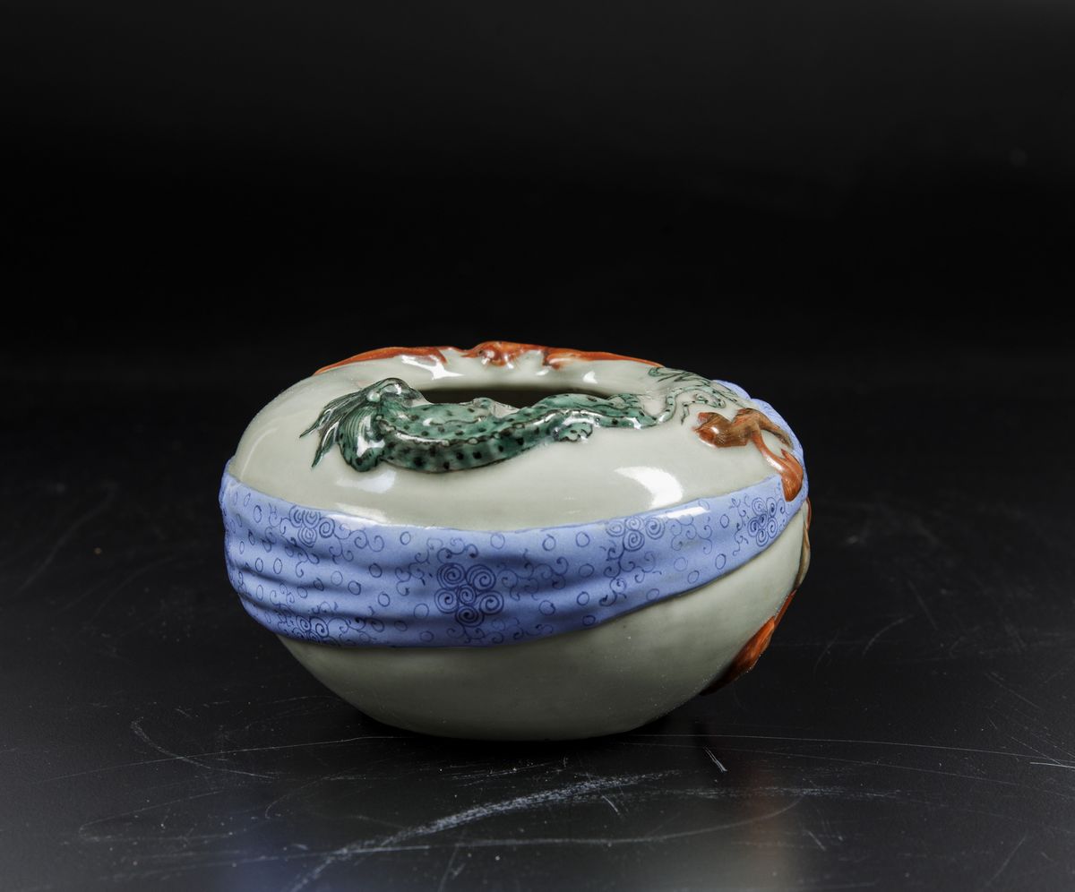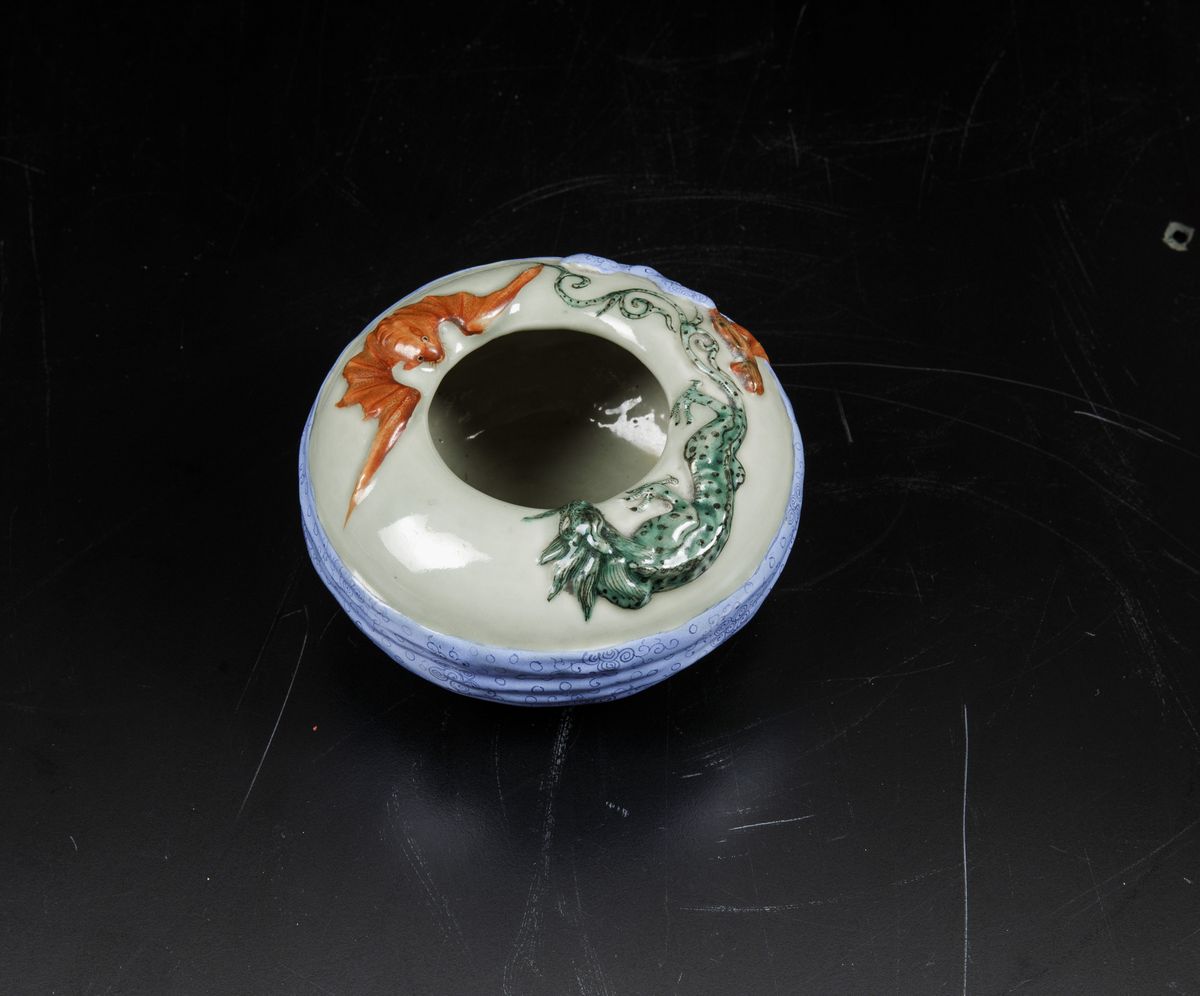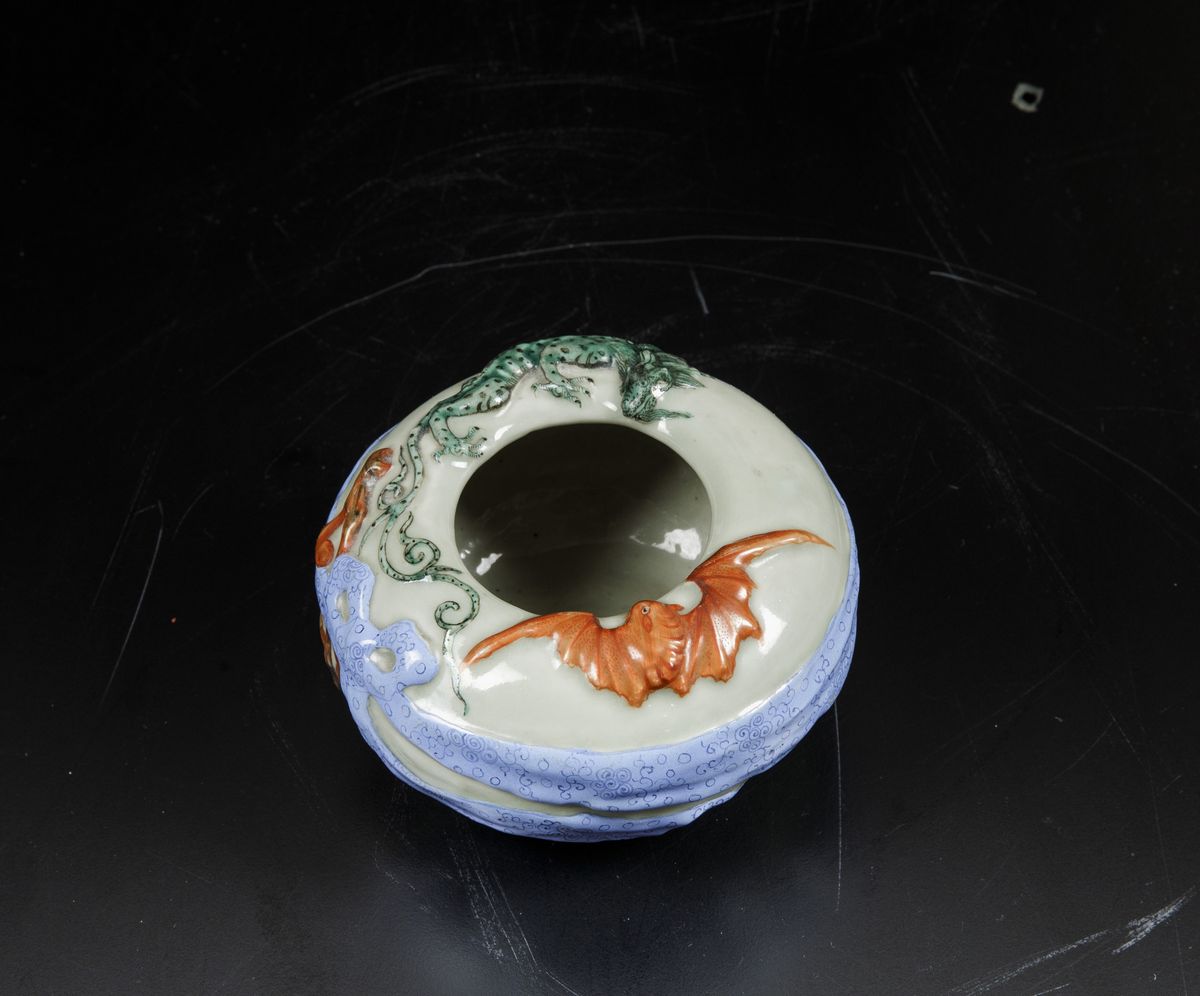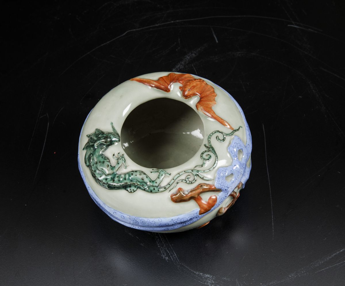 Raro sciacquapennelli in porcellana a smalti policromi con decori a rilievo, Cina, Dinastia Qing, marca e del periodo Kangxi (1662-1722)
