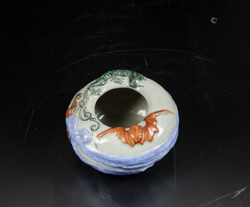 Raro sciacquapennelli in porcellana a smalti policromi con decori a rilievo, Cina, Dinastia Qing, marca e del periodo Kangxi [..]