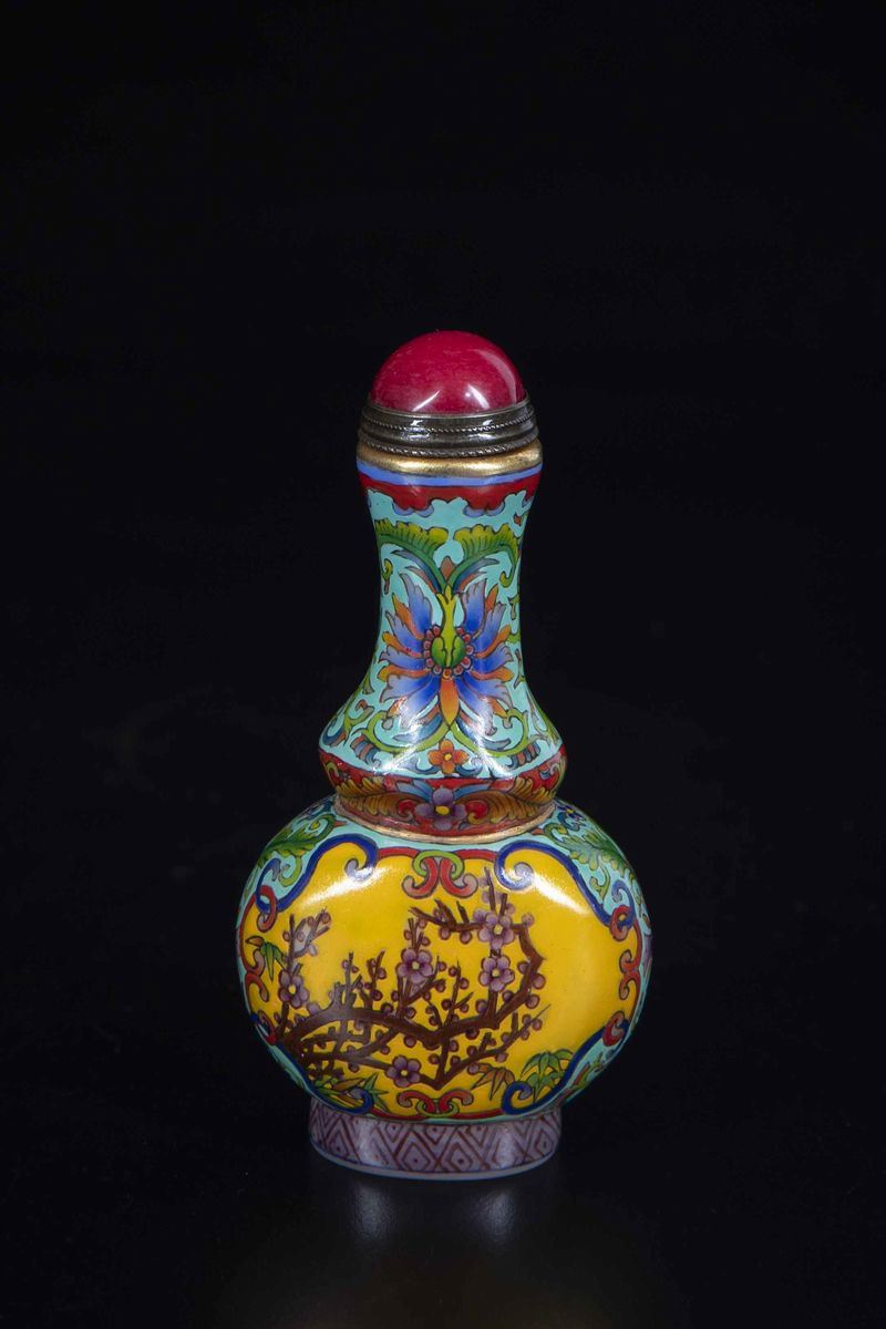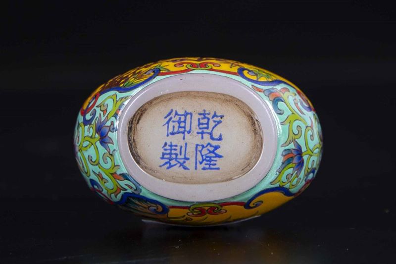 Snuff bottle in vetro dipinto con soggetti naturalisti entro riserve e decori a fiore di loto, Cina, Dinastia Qing, XIX [..]