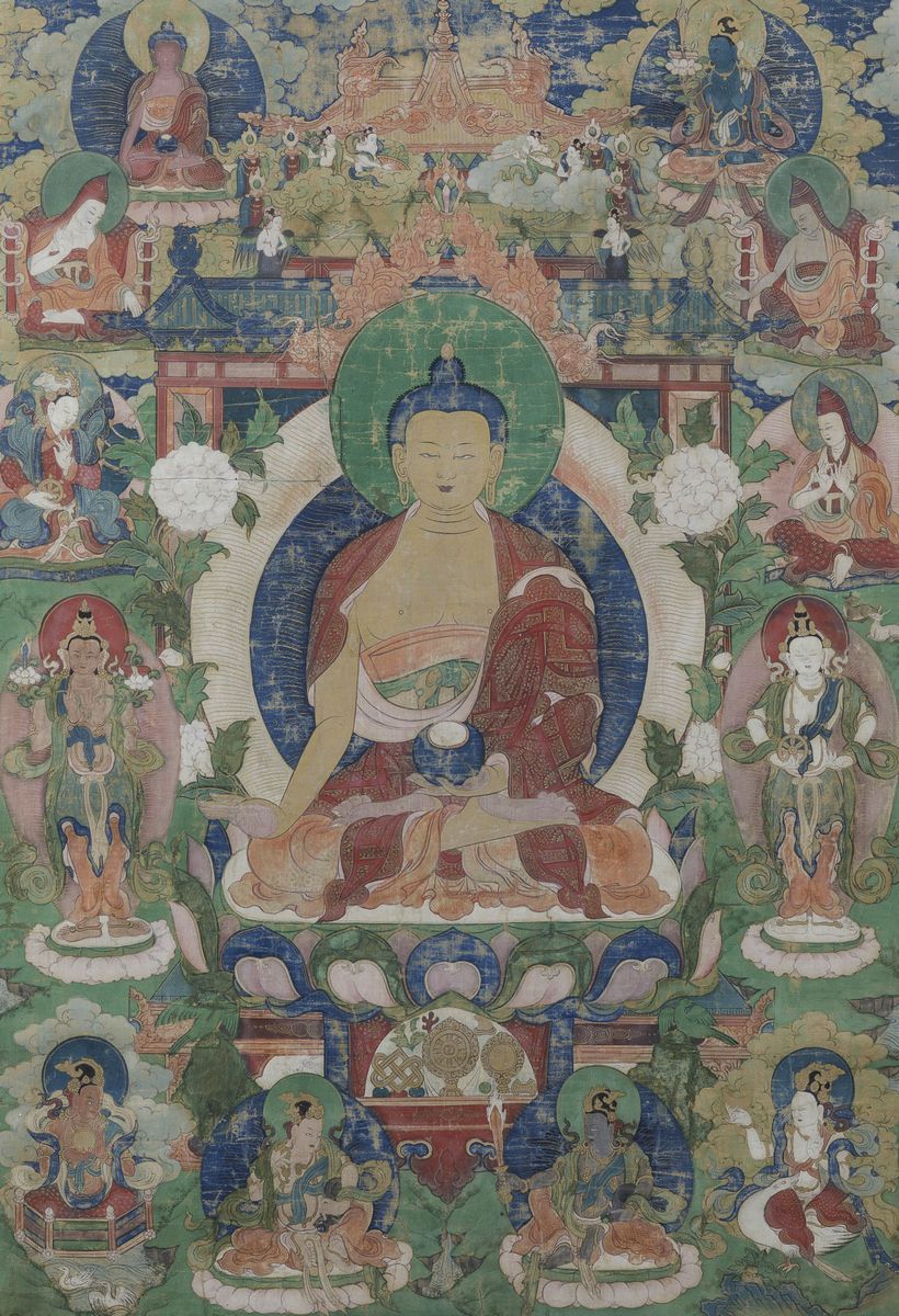 Thangka su seta con Buddha centrale e altre divinità, Tibet, XIX secolo