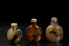 Tre snuff bottles scolpite in agata muschiata, Cina, Dinastia Qing, XIX secolo