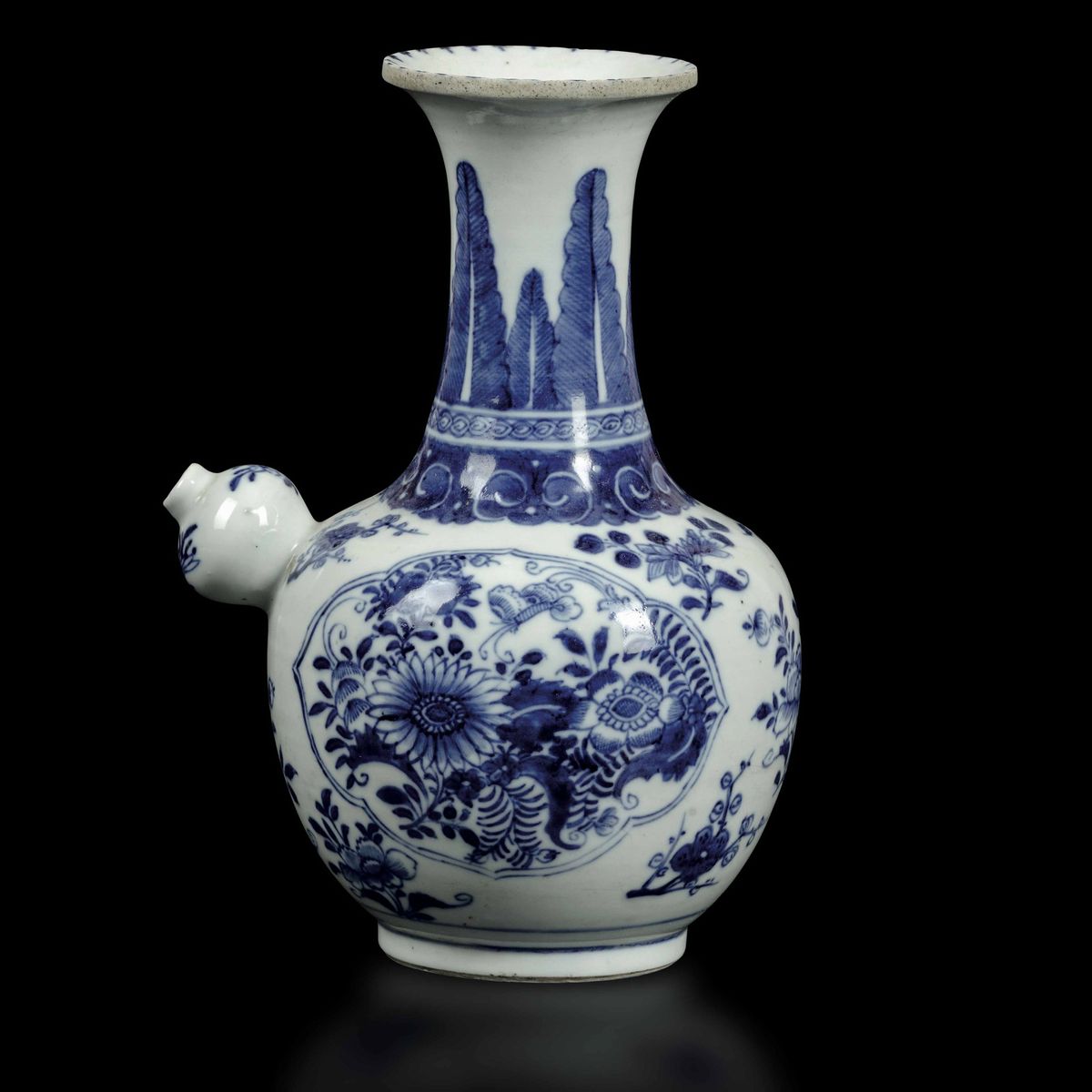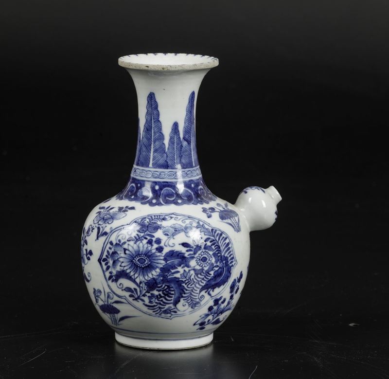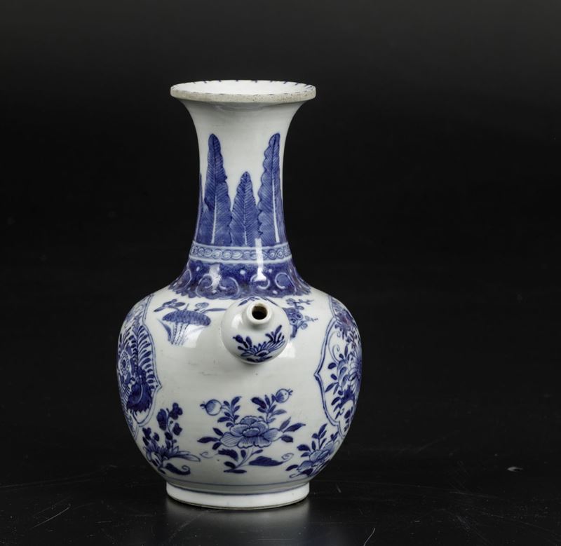 Versatoio in porcellana bianca e blu con decori floreali e soggetti naturalistici entro riserve, Cina, Dinastia Qing, epoca [..]