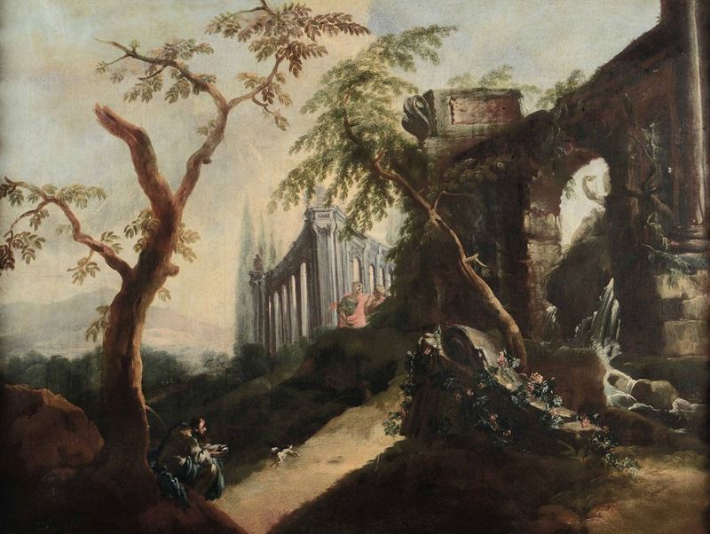 Christian Wilhelm Ernst Dietrich (Weimar 1712 - Dresda 1774), attribuito a Paesaggi con rovine e figure