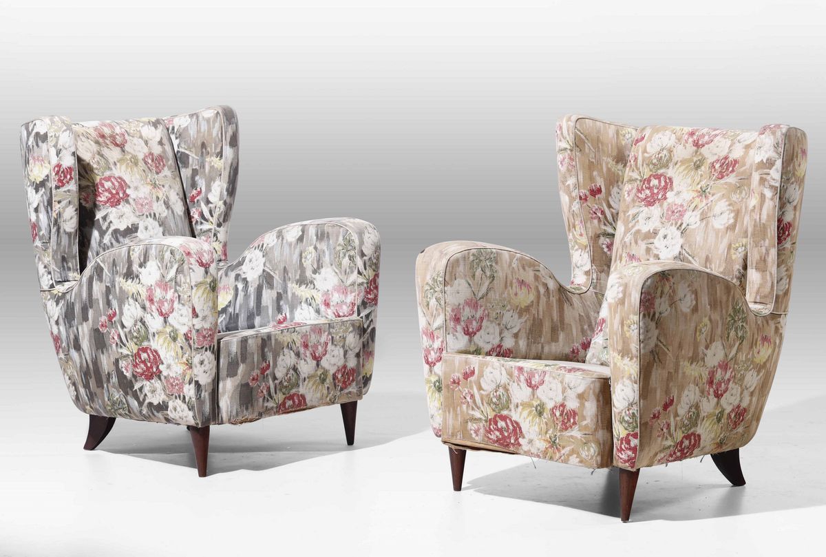 Coppia di poltrone con struttura in legno e rivestimenti in tessuto.