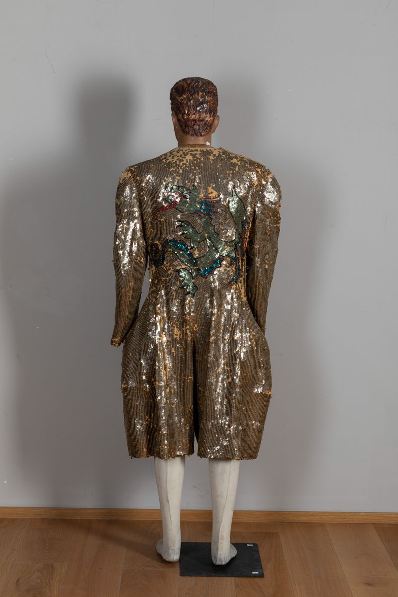 Completamente decorato con pailettes e perline formanti disegni di drago sul fronte e sul retro