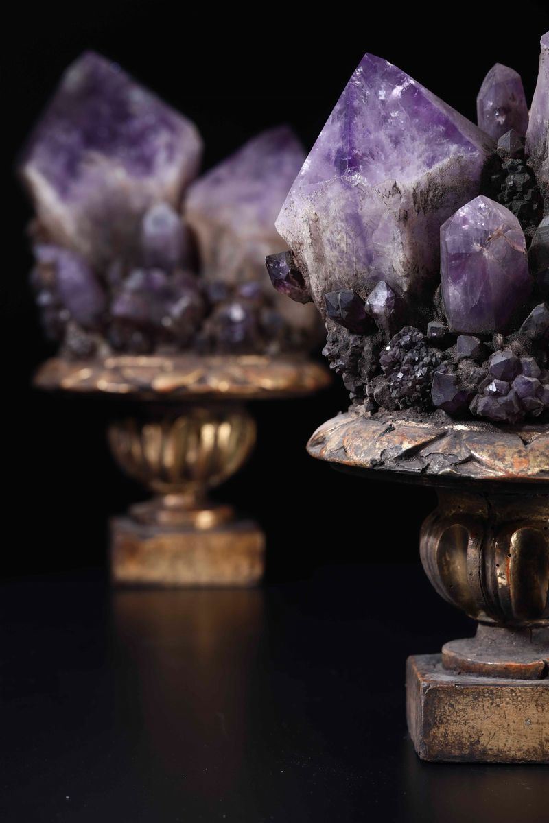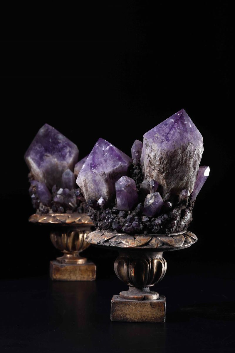 Coppia di cristalli di ametista su base in legno