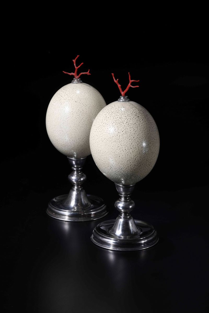Coppia di uova di struzzo con rametti di corallo rosso e base in metallo