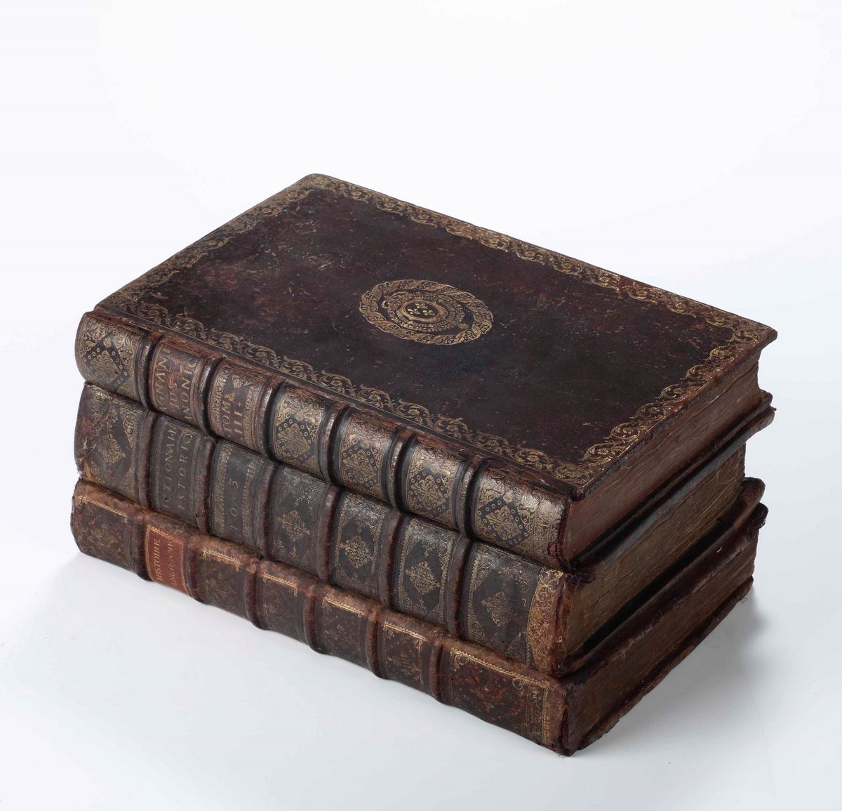 Curioso contenitore di spirits, da studio o biblioteca, realizzato celandolo entro coperture di libri antichi in pelle impressa in oro