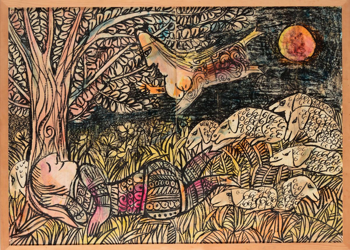 coppia di dipinti preparatori, cm 100x140