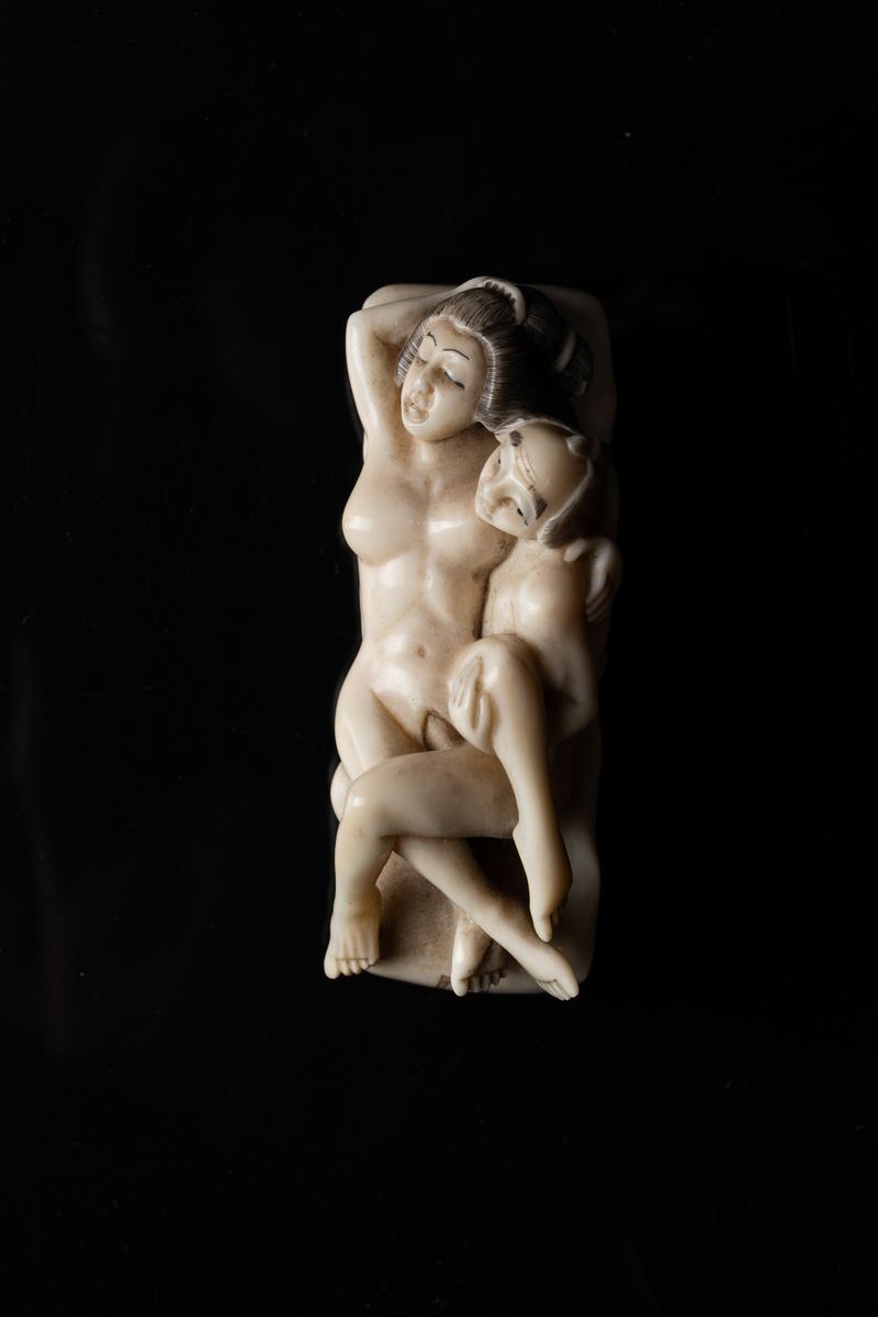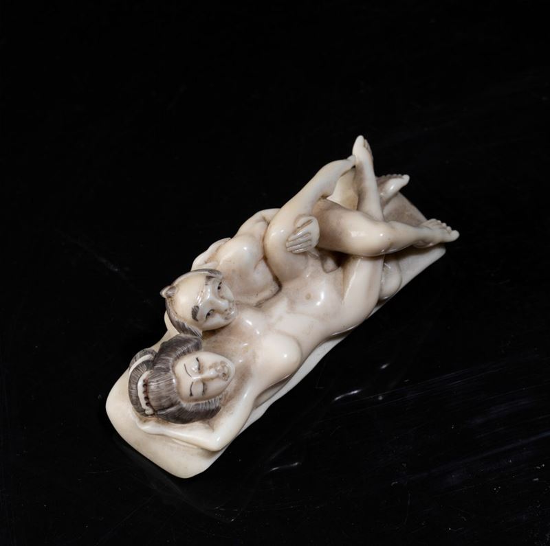 Netsuke a soggetto erotico in avorio scolpito e dipinto. Giappone, inizi XX secolo