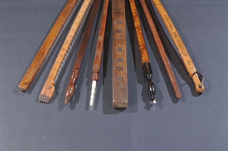 Otto metri da sarto in vari legni con intarsi e applicazioni in avorio e metallo, XIX secolo