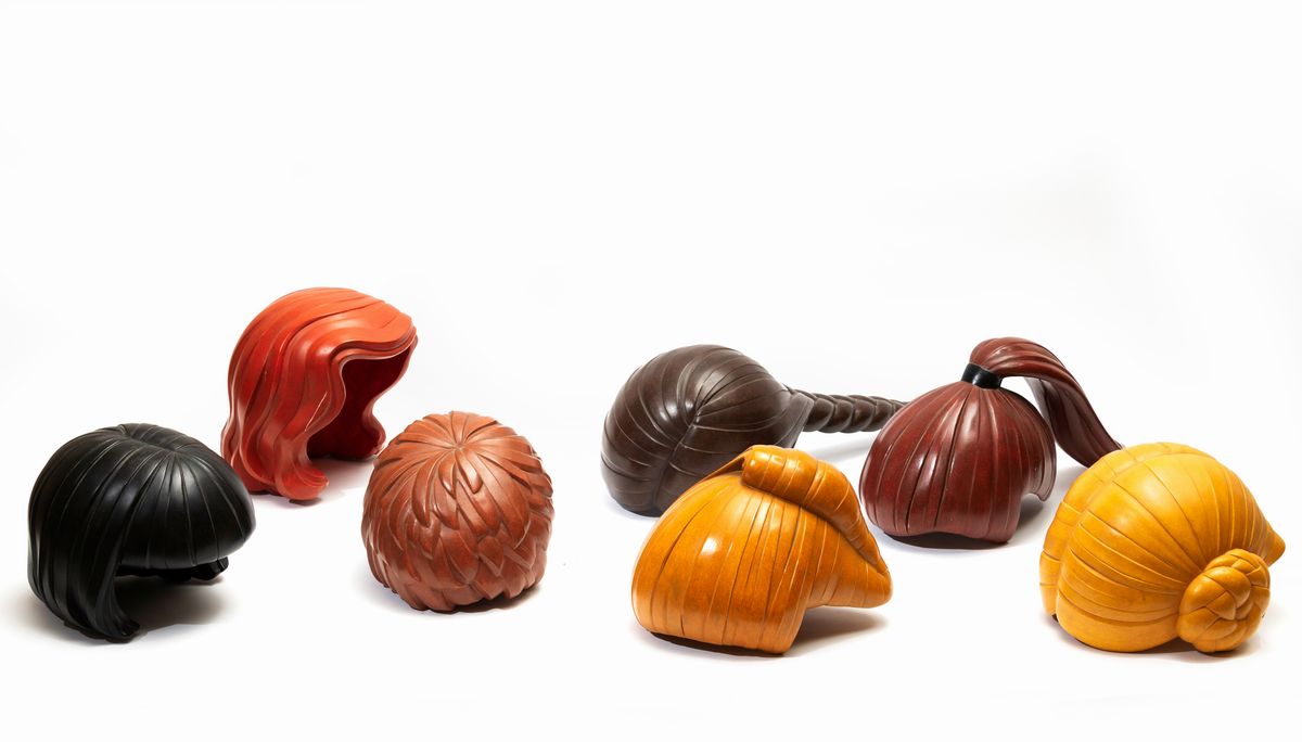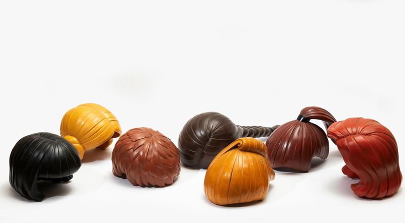 sette sculture raffiguranti parrucche in ceramica smaltata, misure diverse (misura massima cm 52)