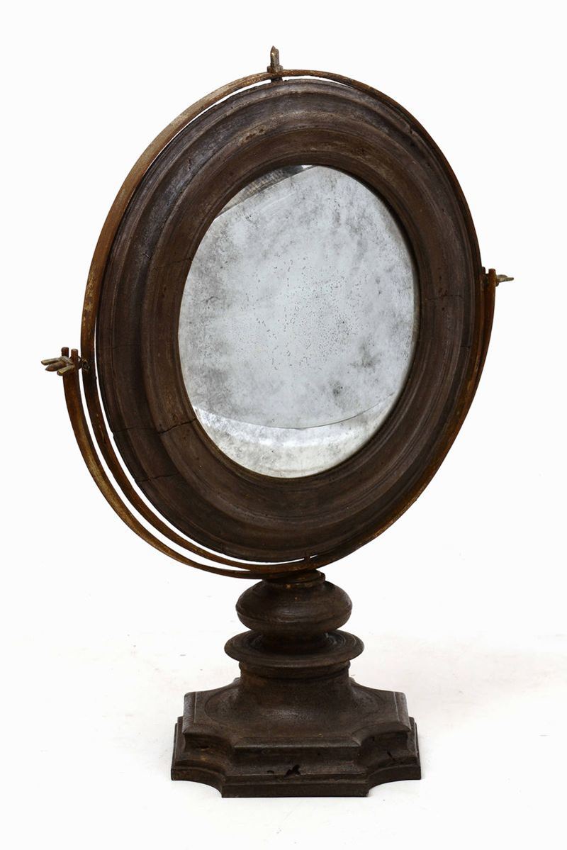 Specchio convesso basculante in legno intagliato con figura di donna alata