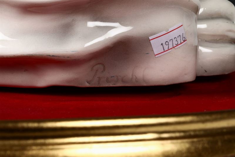 Terraglia. Marca: “Prischl” inciso; etichetta cartacea “Goldscheider Vienna”; simbolo della manifattura “Goldscheider Wien/Made in Austria” in nero; numeri “757” “20” “9” “II OL” incisi; “94” in manganese. Altezza cm 9,5x32x20 . Perfetto stato di conservazione Montata in cornice, cm 52x42