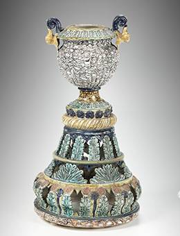 Terraglia. Marca: assente. Altezza cm 48. Minime sbeccature, coperchio mancante Su un’imponente base traforata, formata da tre fasce sovrapposte con motivi vegetali, un vaso biansato con mascheroni funge da coronamento La tipologia di questa ceramica [..]