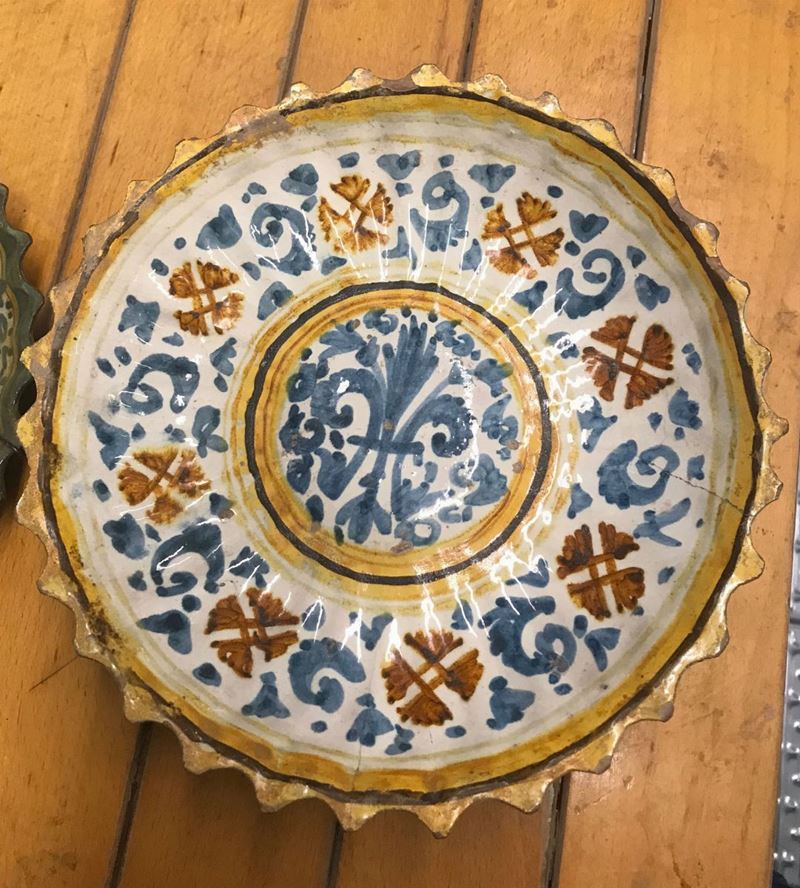 Maiolica a gran fuoco. Altezza cm 7; diametro cm 24,5. Usure, leggera felatura