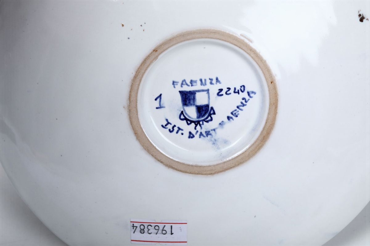 Maiolica. Marca: scudo araldico con “Faenza”, “IST. D’ART FAENZA”, numeri “1” e “2240” in blu. Diametro cm 16,3. Ottimo stato
