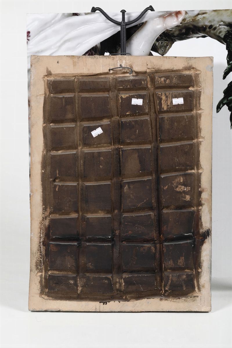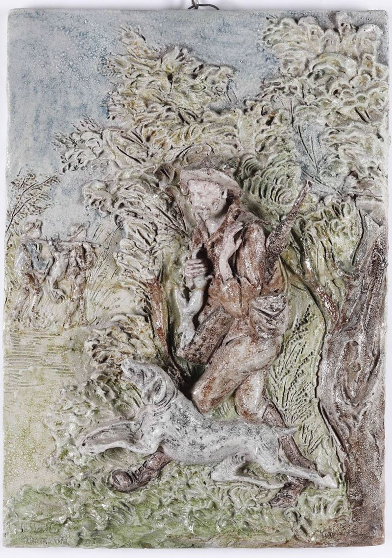 Terracotta invetriata. Marca: assente; firma indecifrabile in basso sul recto. Altezza cm 51x36x6. Ottimo stato di conservazione; alcune imperfezioni e pezzetti rincollati (ad es. un fucile è rotto e rincollato in due punti)