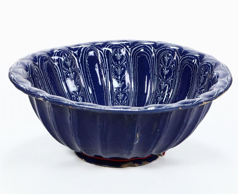 Il bacile, dalla forma circolare baccellata su basso piede, è ricoperto da smalto turchino e percorso all’interno da una fitta trama decorativa a steli filiformi in bianco. Al centro ampio rosone con sottili ramoscelli fogliati