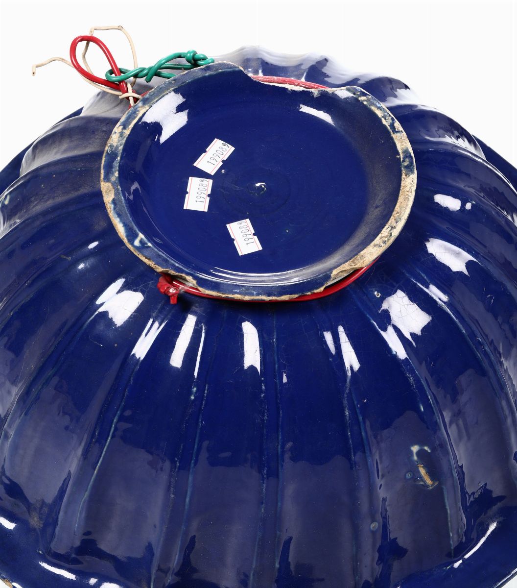 Maiolica a gran fuoco. Marca: assente. Altezza cm 16; diametro cm 39,5. Due felature; sbeccature al bordo del piede