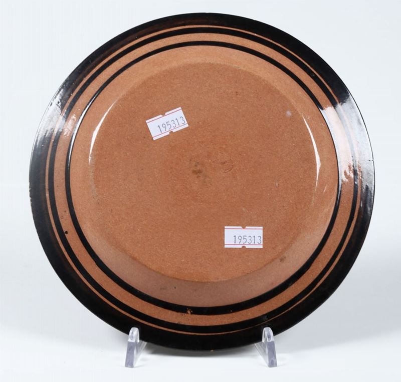 E’ decorato “all’etrusca” con figure rosse, su terraglia nera lucida, racchiuse in una greca. Sulla tesa foglie stilizzate