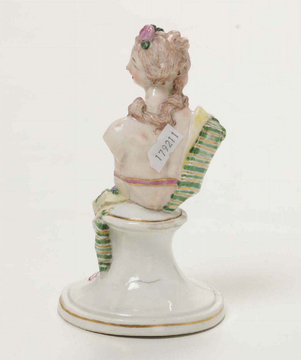 Il busto appartiene ad una serie con le allegorie delle quattro stagioni. La nostra scultura raffigura la Primavera rappresentata da una giovane agghindata con un drappo e fiori a rilievo. Sulla base un cartiglio a rocaille ospita la marca della manifattura, ossia lo scudo bavarese