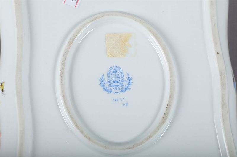Porcellana policroma. Marca: marca giubilare con stemma, “Herend Hungary”, “Handpainted 150” “1826” “1976”, lettere e numeri diversi in blu. Dimensioni: cm 27 x 17,5. Un manico rincollato