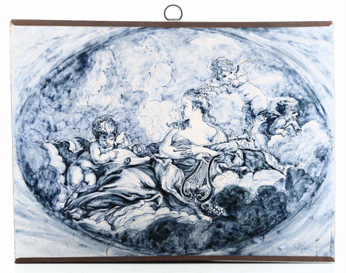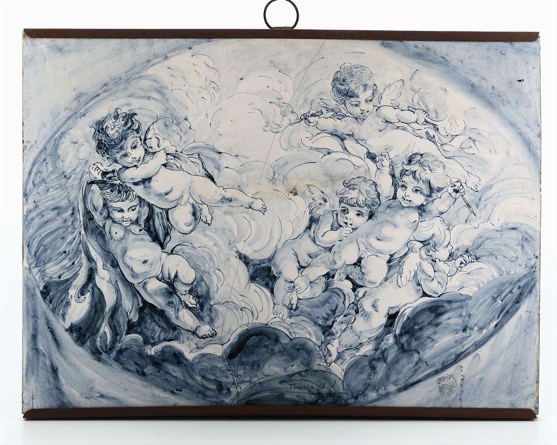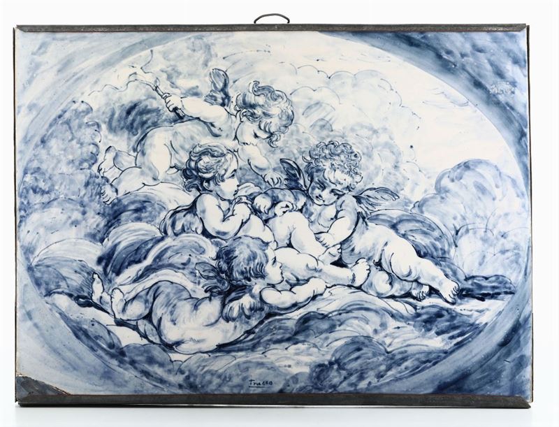 Maiolica monocroma blu. Firmate “Trucco” in blu. Dimensioni: cm 29 x 39. Una targa rotta in due frammenti, le altre in ottimo stato