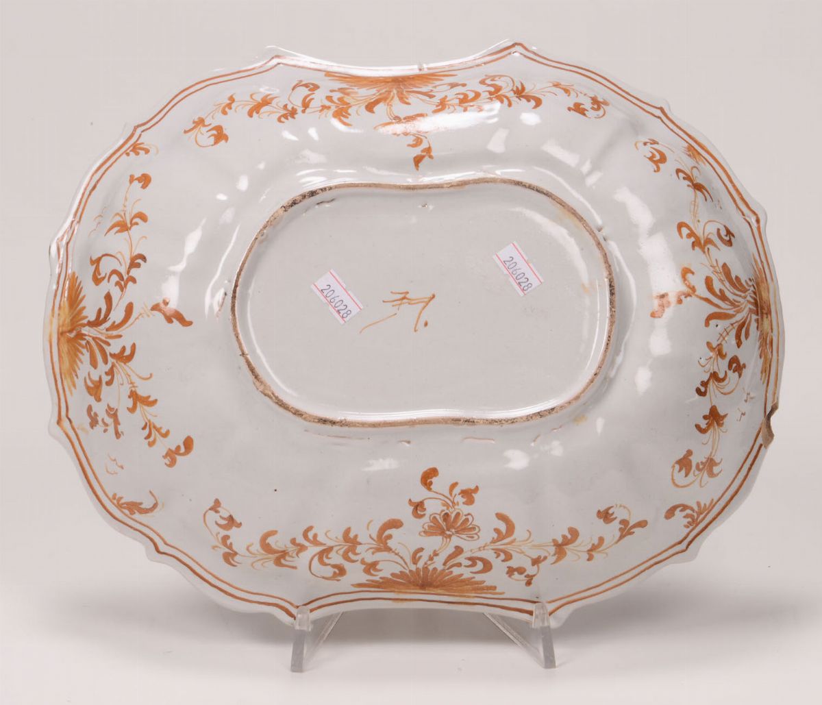 Maiolica. Marca: indecifrabile. Dimensioni:altezza cm 6x32x26 Buono stato di conservazione, una sbeccatura al bordo