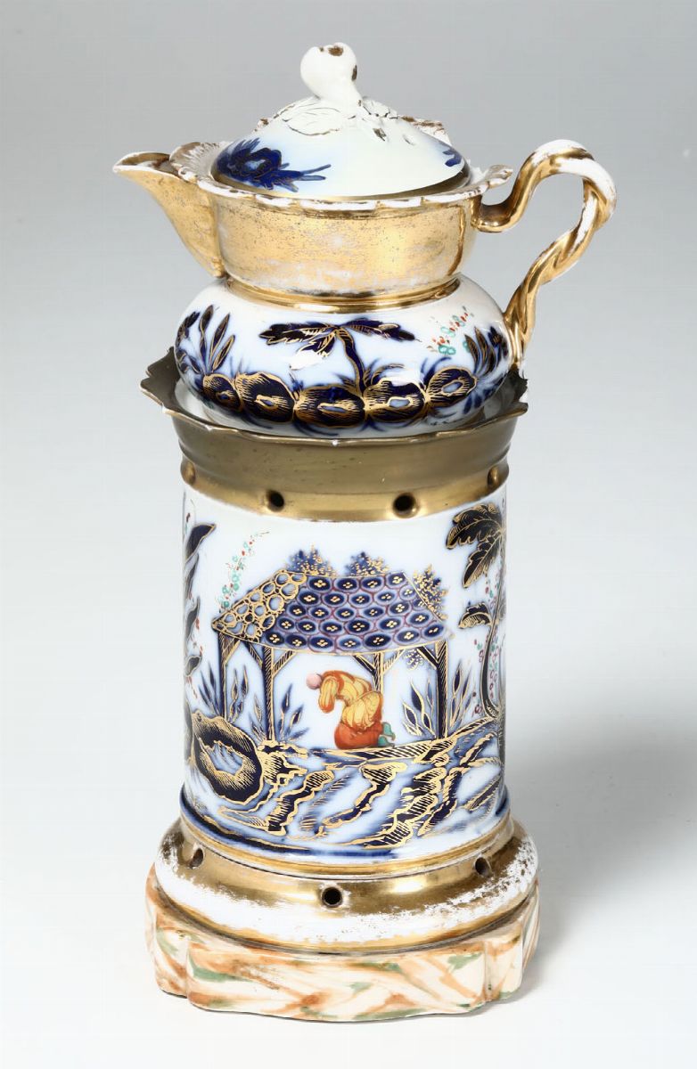 Il bricco è sorretto da un corpo cilindrico con fori per ospitare una candela o un lumino ad olio, che, bruciando, mantiene caldi infusi o tisane. La decorazione pittorica è a paesaggi orientali nei toni blu e oro con un cinesino in policromia sotto ad una tettoia