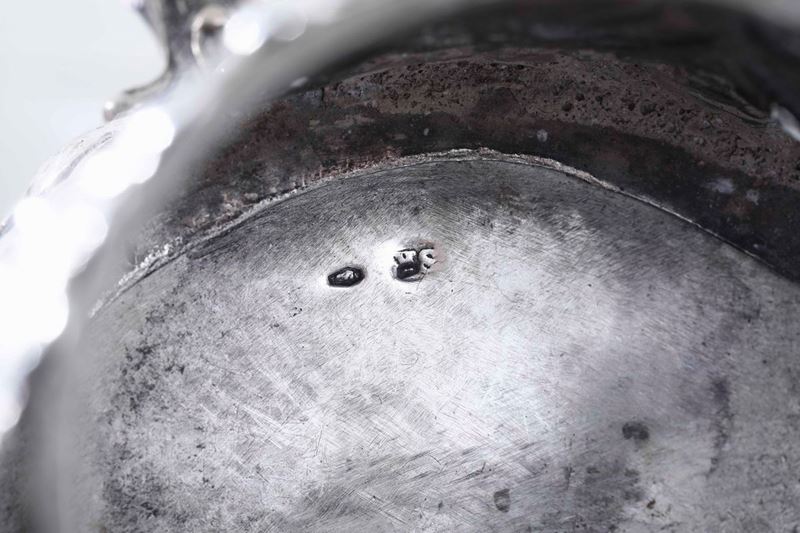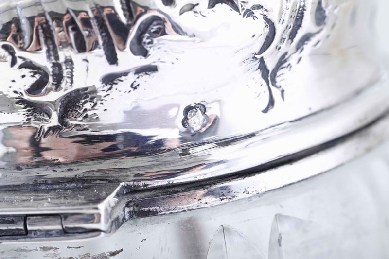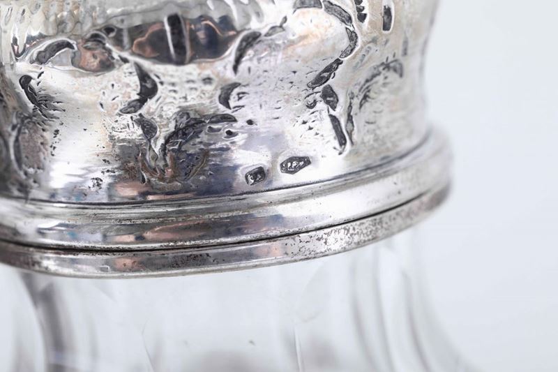 Acetoliera in argento fuso, cesellato e traforato, ampolle in vetro molato. Impero Austro-Ungarico XIX-XX secolo